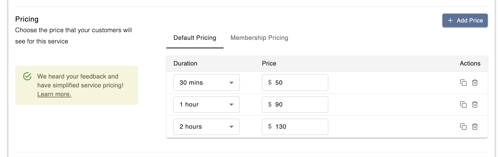 You can create as many prices as you'd like, as long as they are unique (target different durations or different membership groups). For a deeper breakdown on how prices work, visit the Services Pricing section.