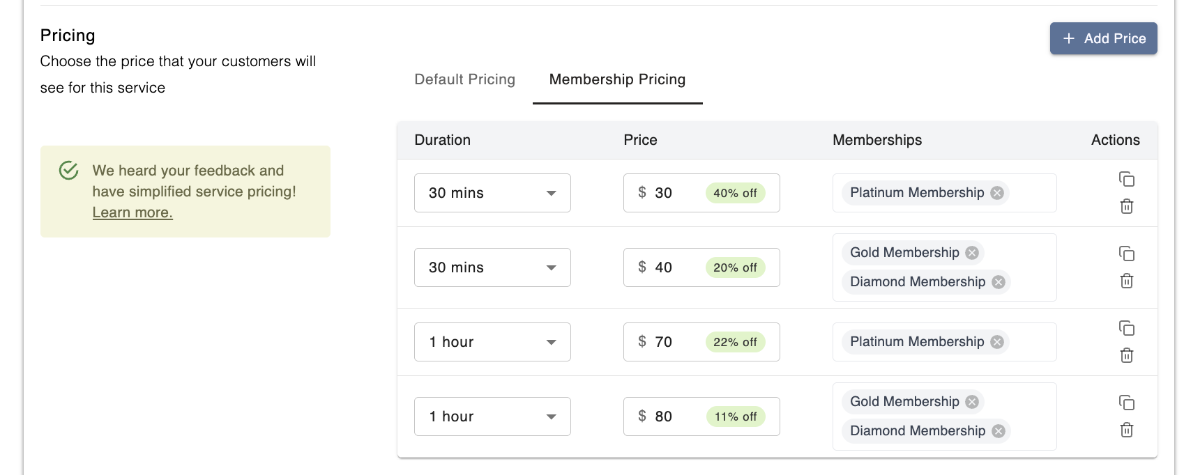In the example above, we've set a discounted rate of $30 for 30 minutes which only to members with the Platinum Membership. Whereas, those with the Gold or Diamond Membership will receive a different discounted rate to the same service (i.e, $40 for 30 minutes).
