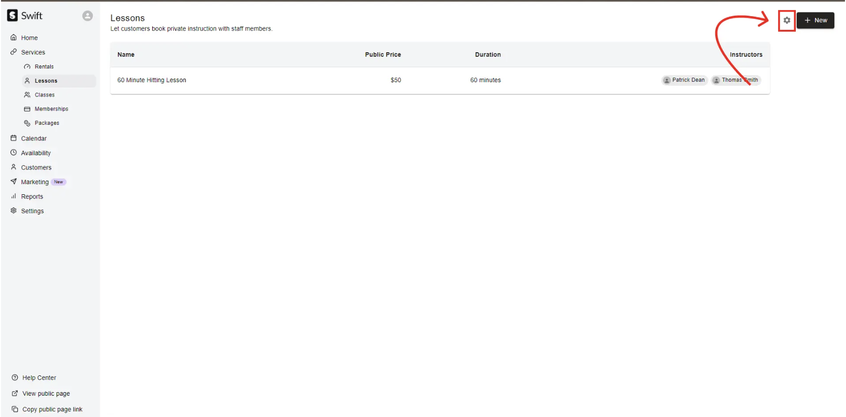 You may also want to control how the "Lessons" category as a whole appears on the booking page. You may want to call it "Private Sessions" or "1:1s" instead of the generic "Lessons" shown on Swift. In that case, you can visit the Services > Lessons page in your admin dashboard, and click the "Gear" icon on the top right.