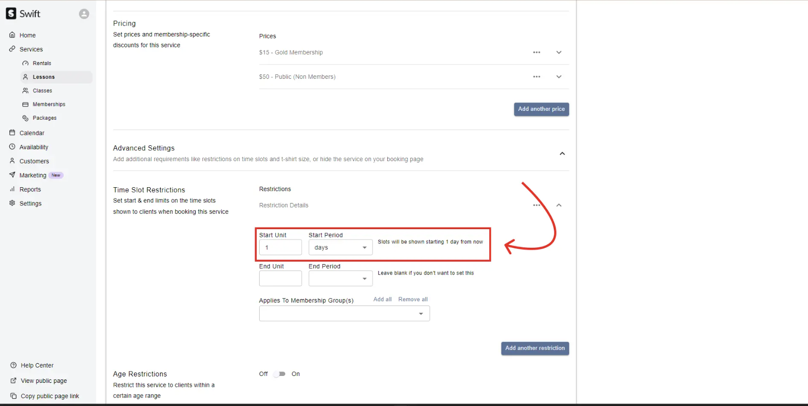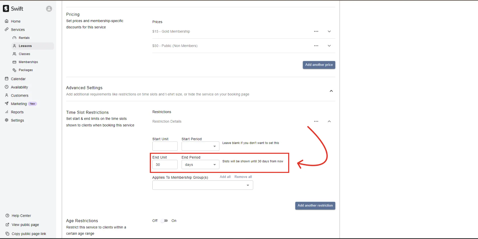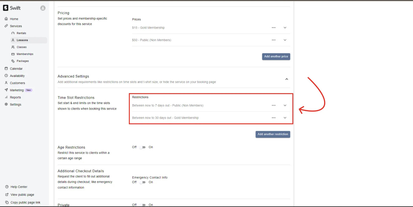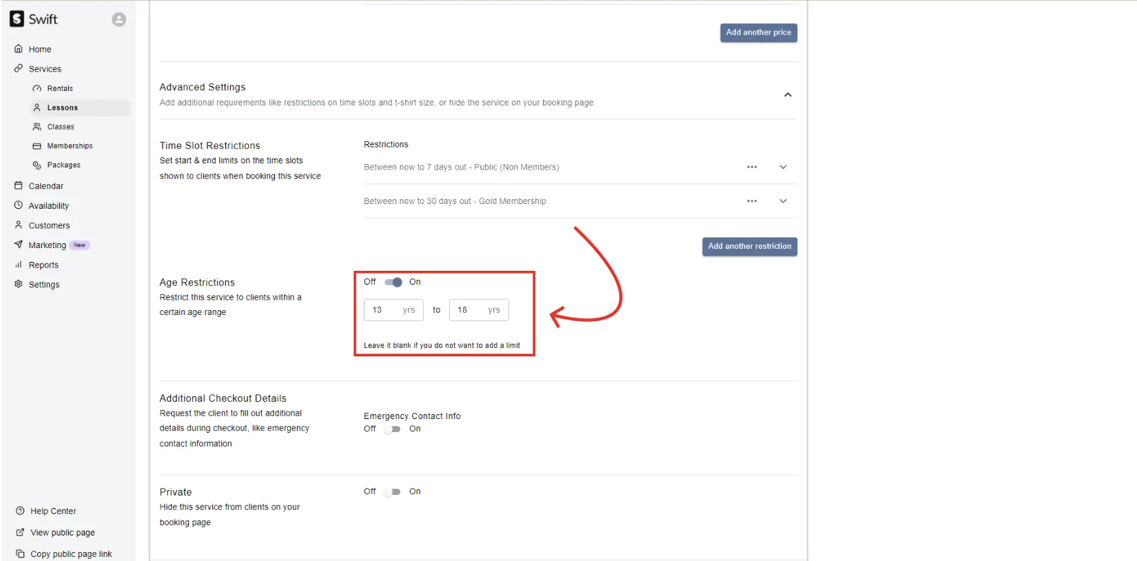 If you offer lessons for specific age groups, you can set restrictions in Swift so that only players of the expected ages can book the lesson.
