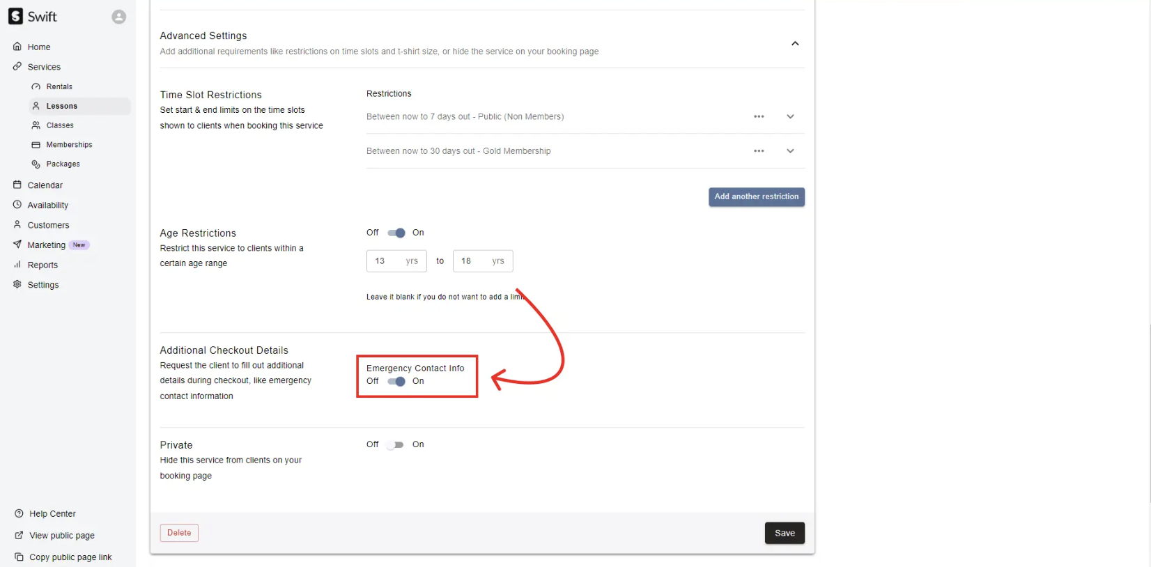 Here, you can choose to ask for "Emergency Contact info" from clients when they book this lesson online.