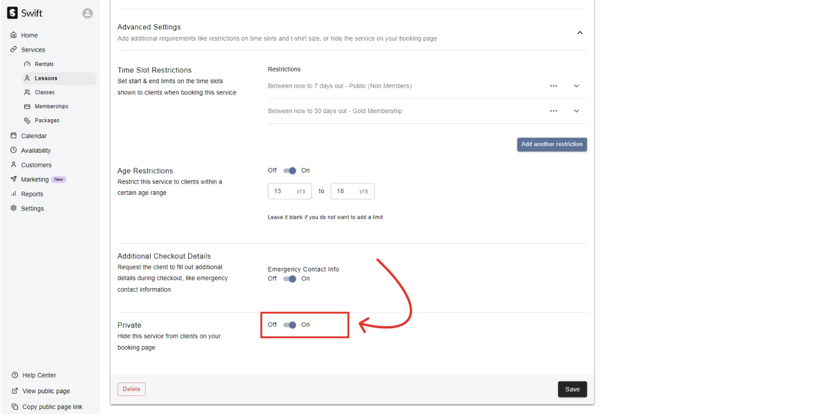 By making this lesson private, only customers with a direct booking link to this lesson will be able to book it. It will be invisible to all other customers, and will not appear on your booking page.