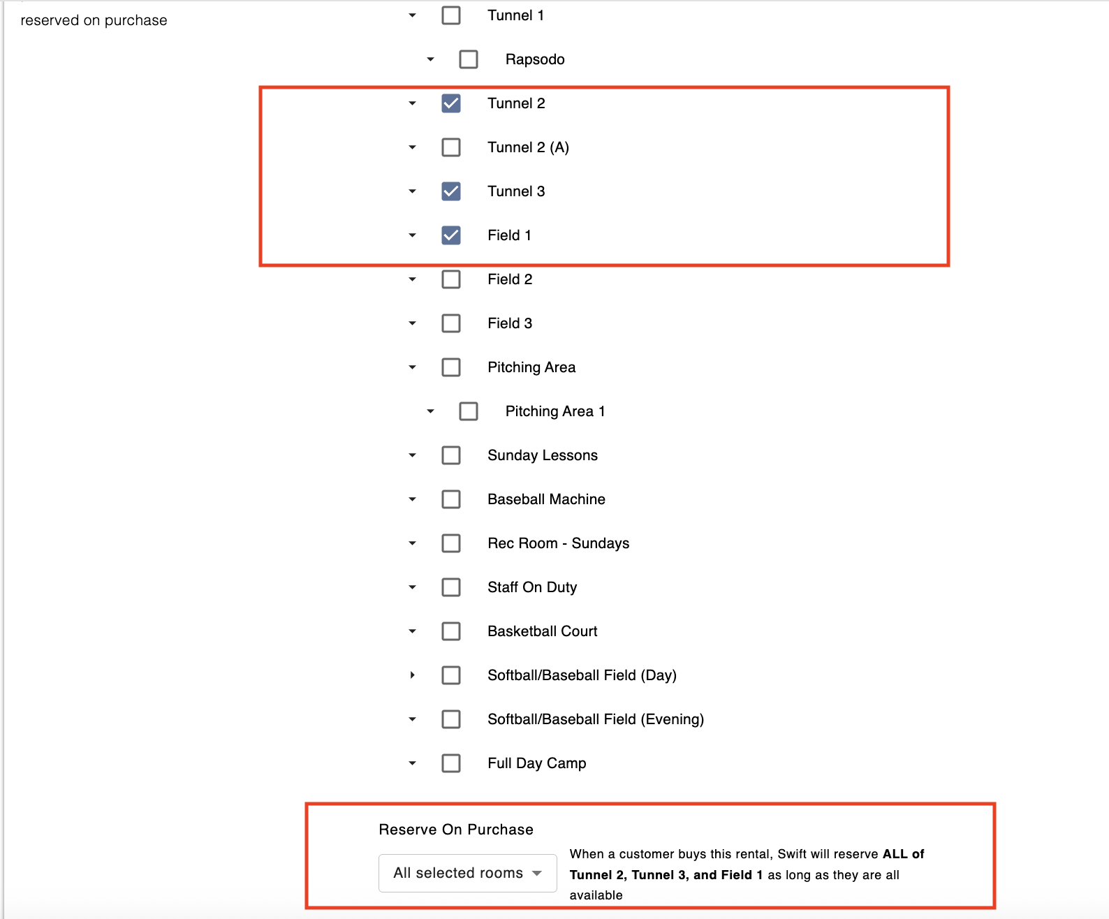 For example, an instructor offers a lesson that requires "Hitting and Fielding Lesson" that requires 2 cages + 1 field. You would select all the required rooms and change the setting to "All Selected Rooms".. By doing so, a customer will see timeslots where the coach AND all the selected spaces are available, and will block them all off when they book.