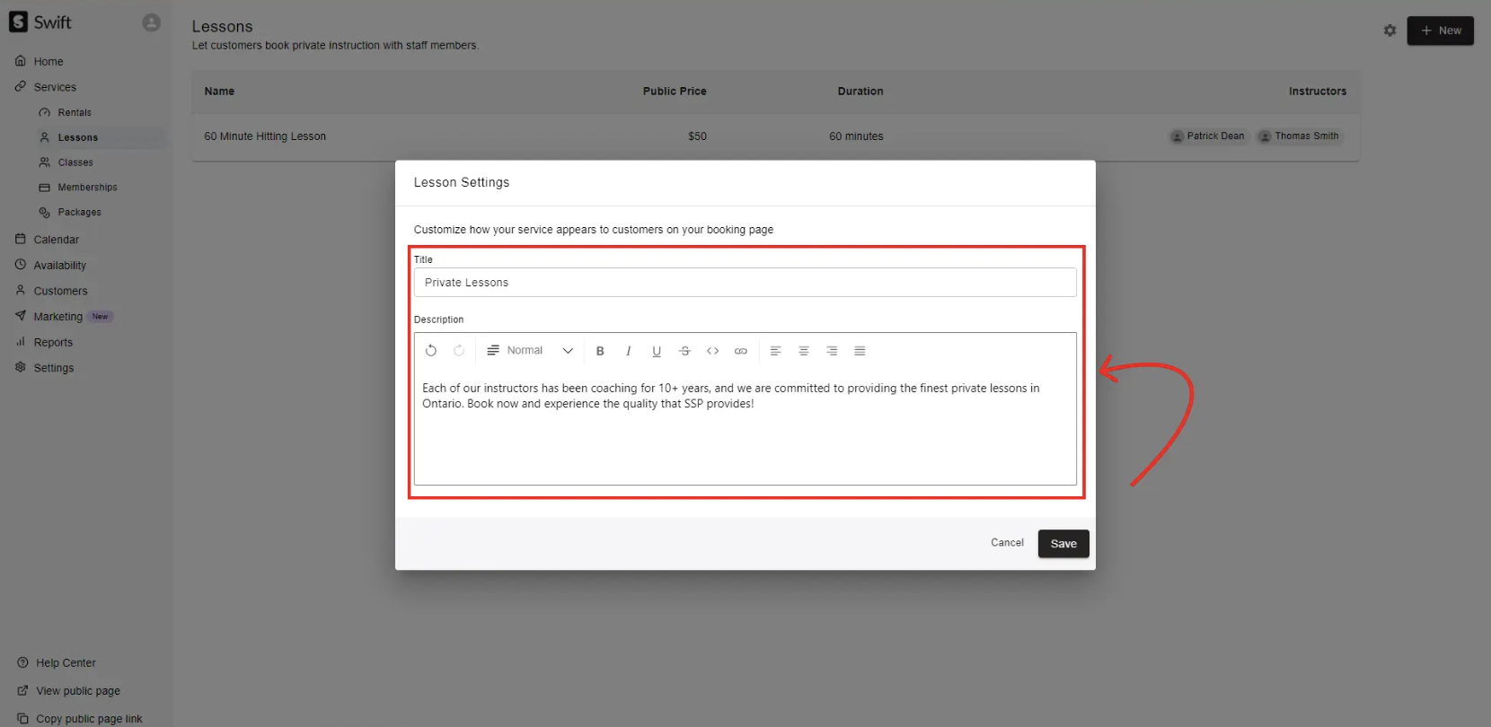 To edit a lesson, click into the specific lesson from the Services > Lessons page and you will be taken to the "Edit Lesson" form.