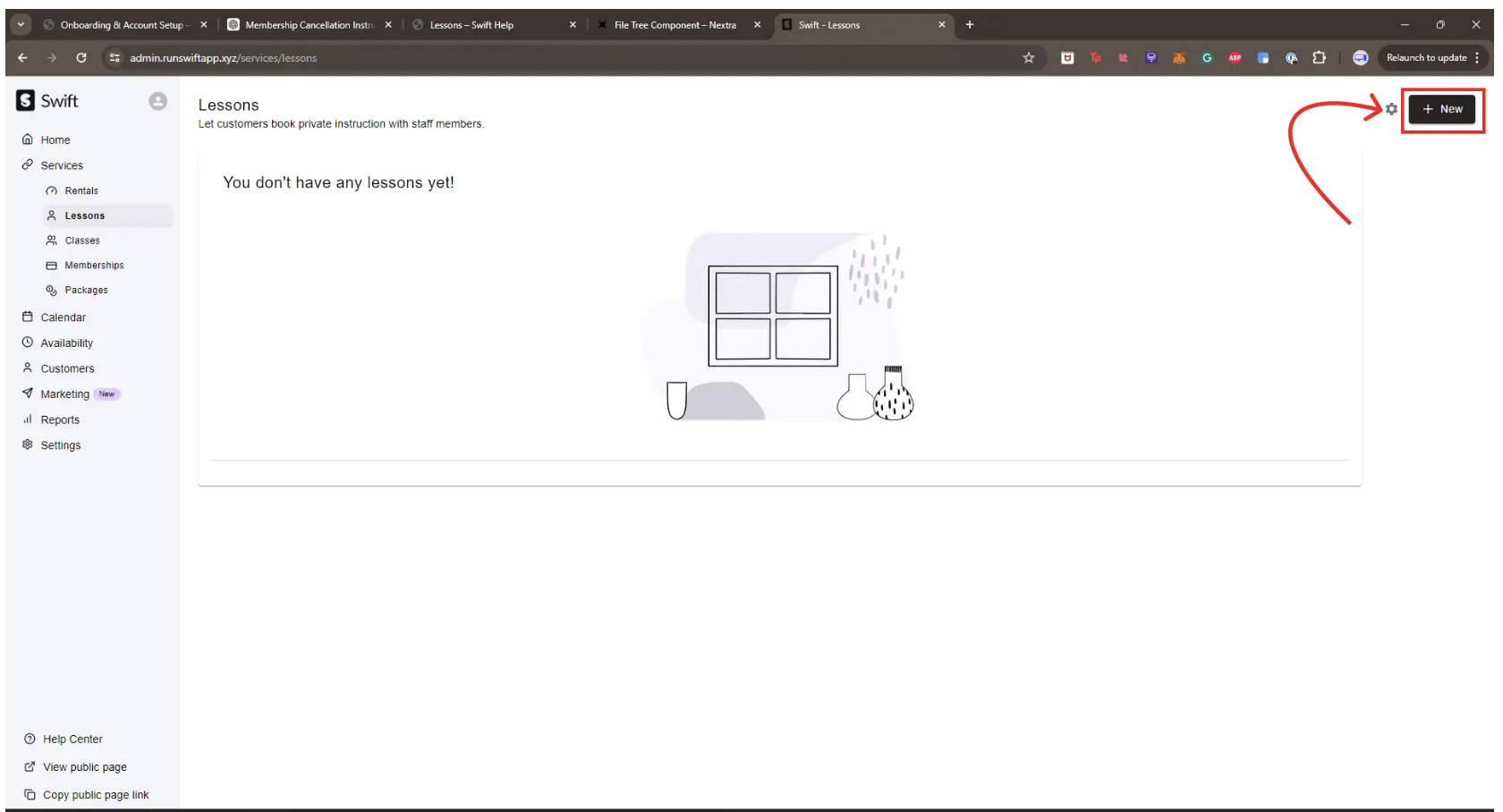 To view the existing lessons at your facility, just navigate to Services > Lessons in your Admin dashboard. There, you'll see a list of the different lessons offered at your facility.