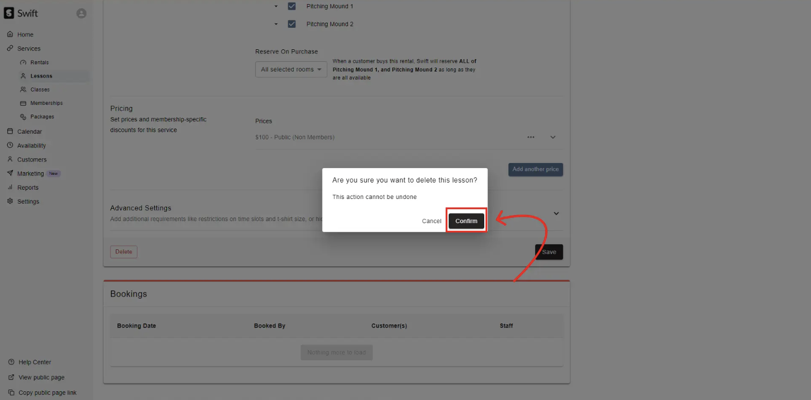 Please note that this button may be disabled if you've already had existing bookings tied to this lesson. It may also be disabled if you don't have the permission to delete it (in which case, you should talk to the owner or someone with more access).