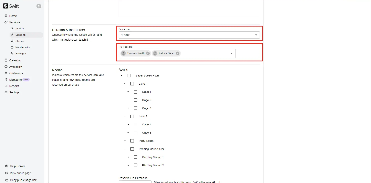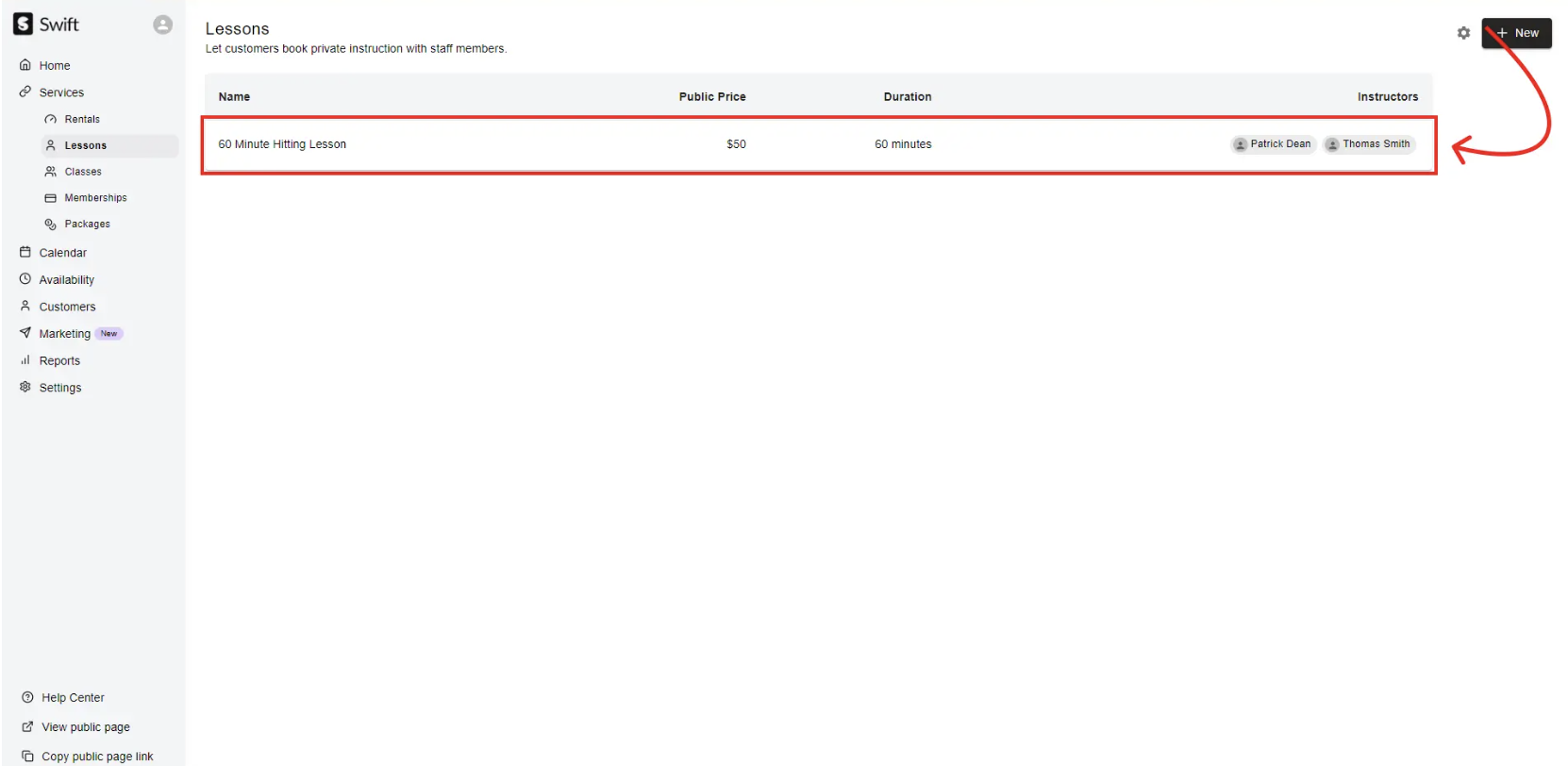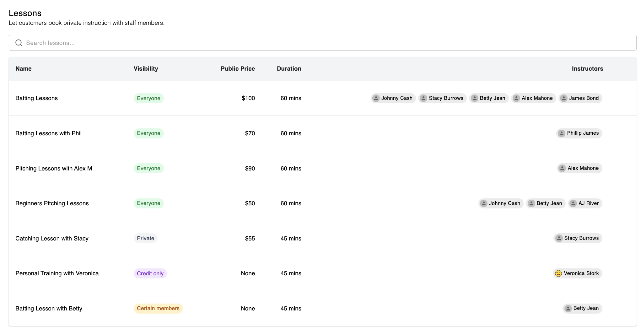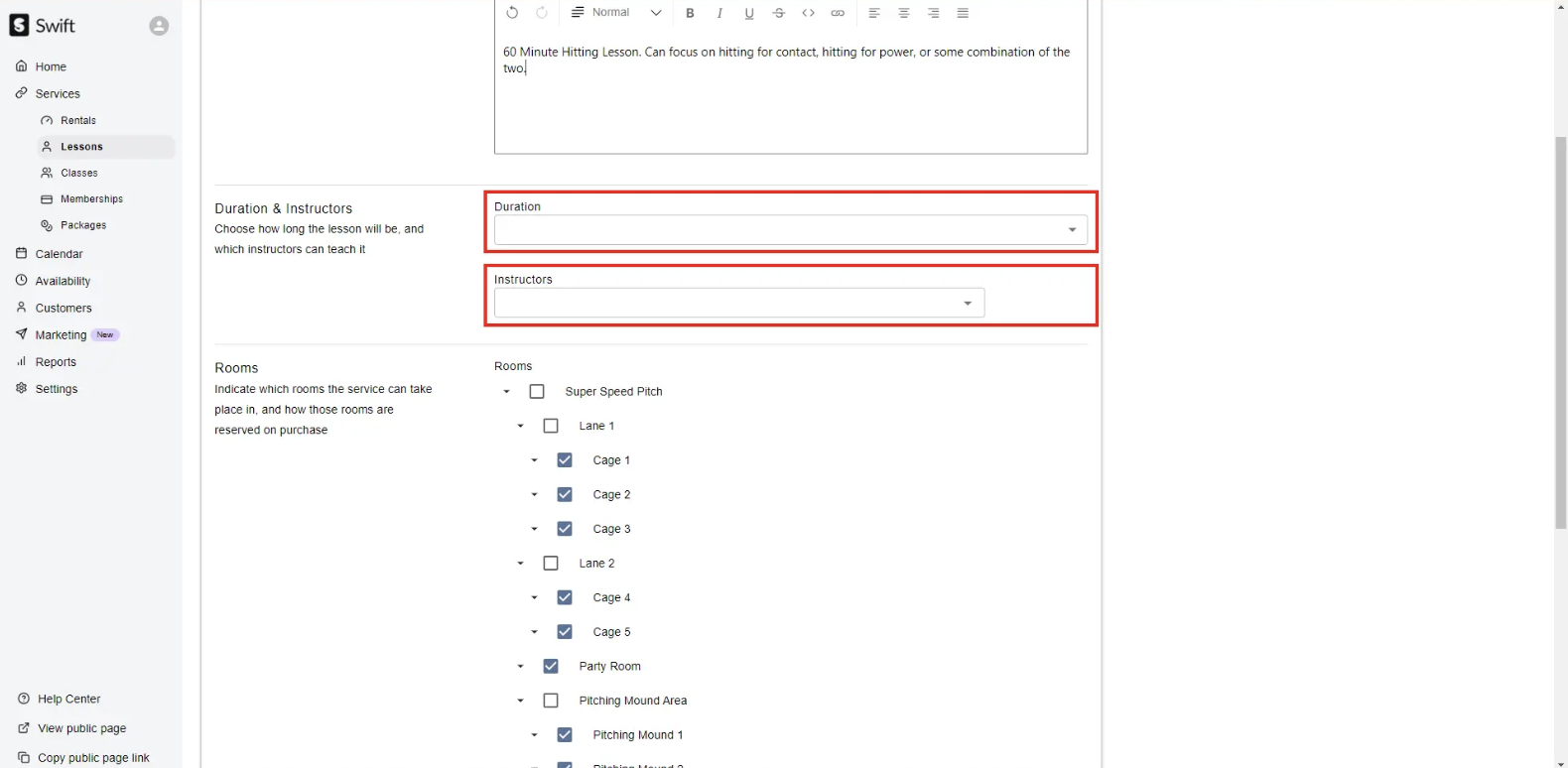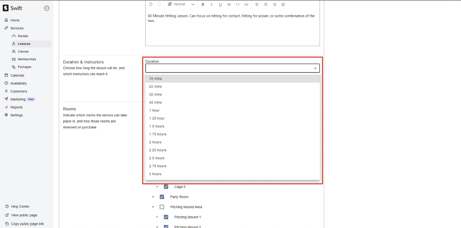 If you have multiple "types" of the same lesson with varying durations or varying prices (for example: 30-Minute Hitting Lesson, 60-Minute Hitting Lesson, etc.), you will need to set up multiple lessons in Swift.