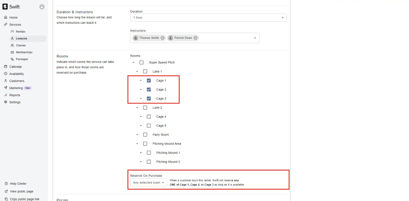 For example, if you offer a Hitting Lesson that can happen in any one of 3 cages at your facility, then you can select this option. By doing so, a customer will get auto-assigned into any one of the 3 cages based on the room + coach's availability.