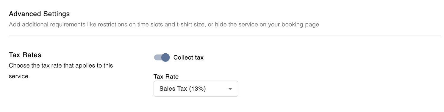 Enable the "Collect tax" toggle to set and charge customers a pre-defined tax rate when they purchase this lesson. This will populate the correct tax amount on your booking page, as well as internally on the admin side of Swift when you charge customers.