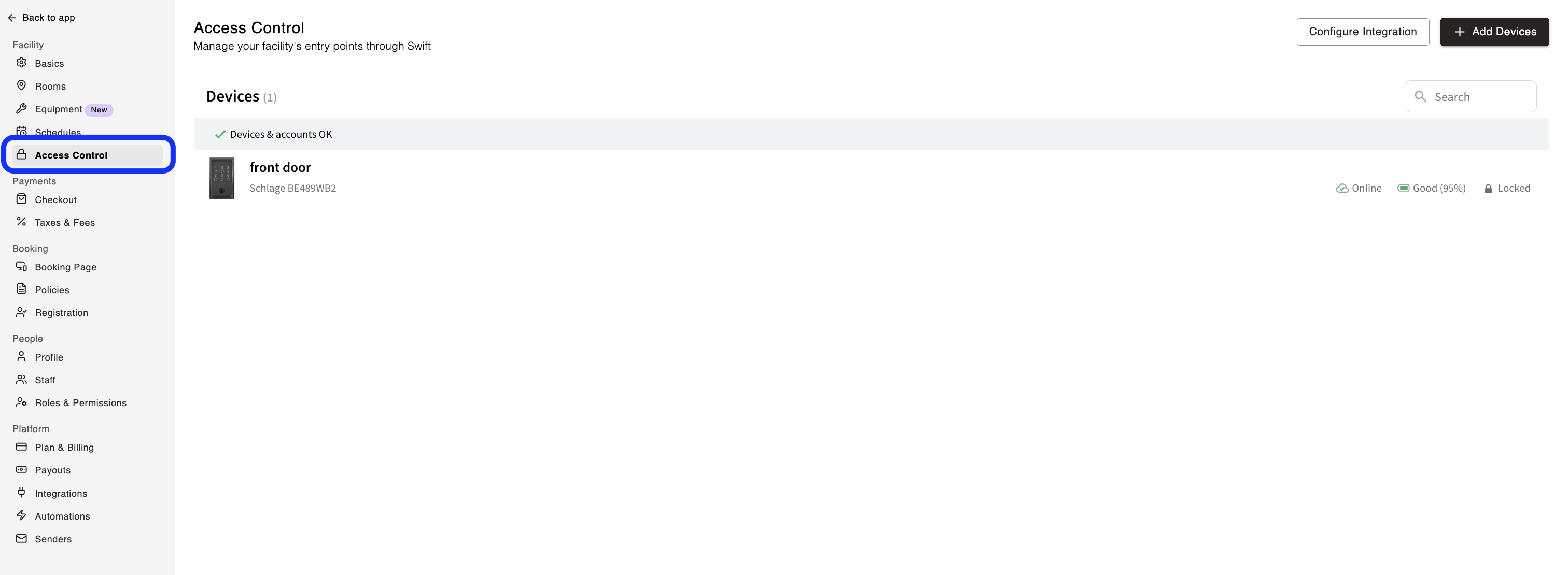 The integration works by creating access codes for anyone who makes a booking at your facility. Swift communicates with your internet connected smart lock and manages these access codes. It also allow you to remotely lock or unlock the device.