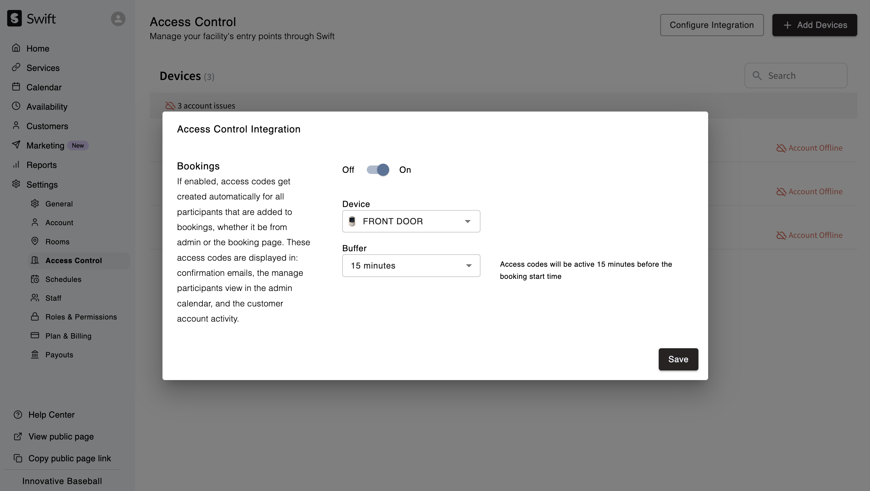 Once this integration is enabled in Swift, any rental bookings made through the platform will automatically generate a time-bound code on your device with start and end times that match the bookings start and end times. You can also configure a start time buffer so that the codes are active either 15 or 30 minutes prior to the booking start time.