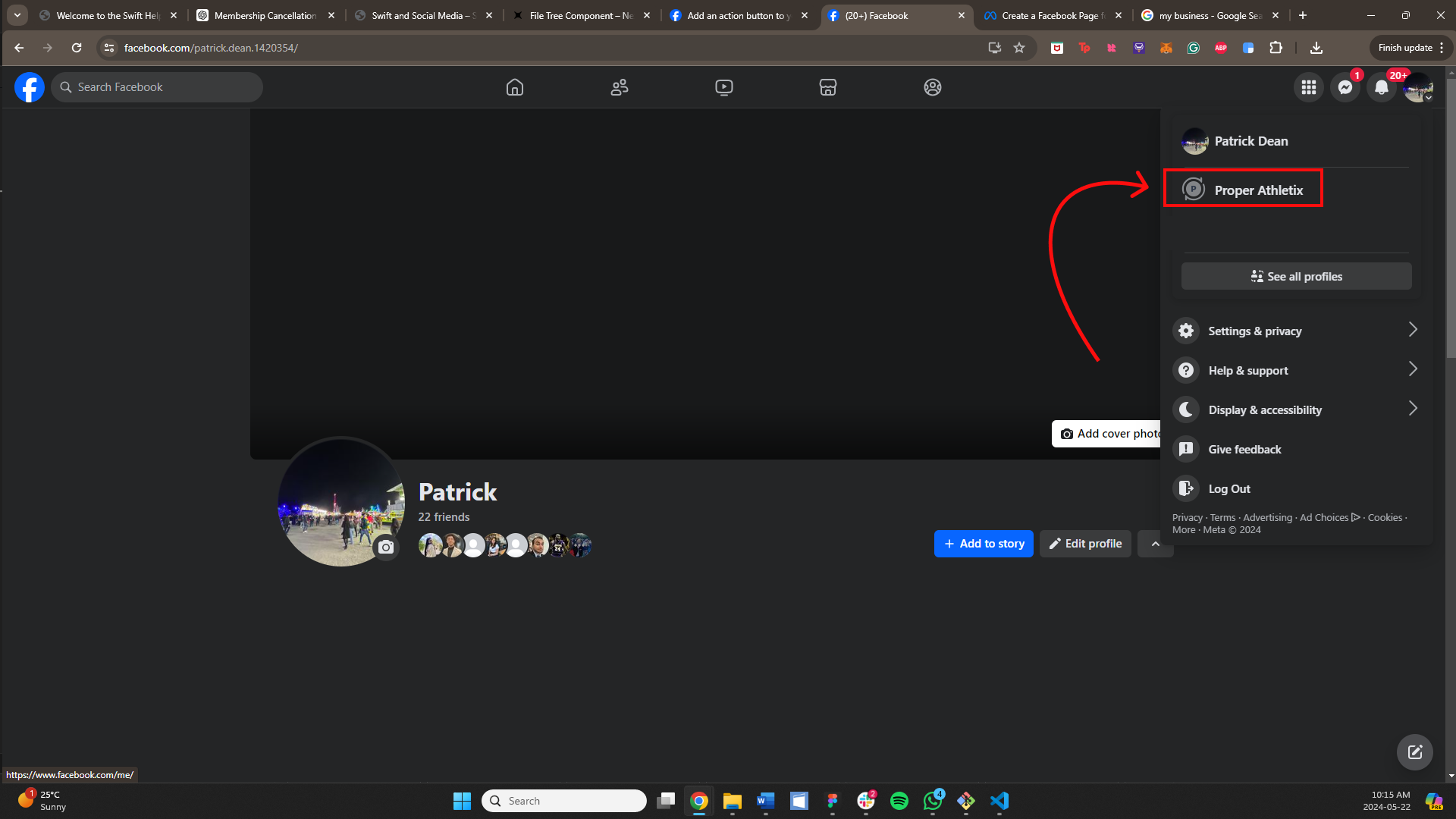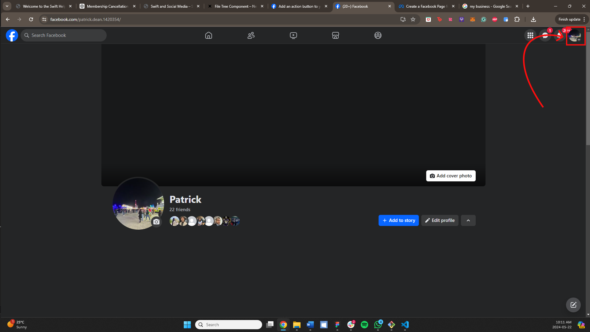Log into Facebook and click your profile photo in the top right.