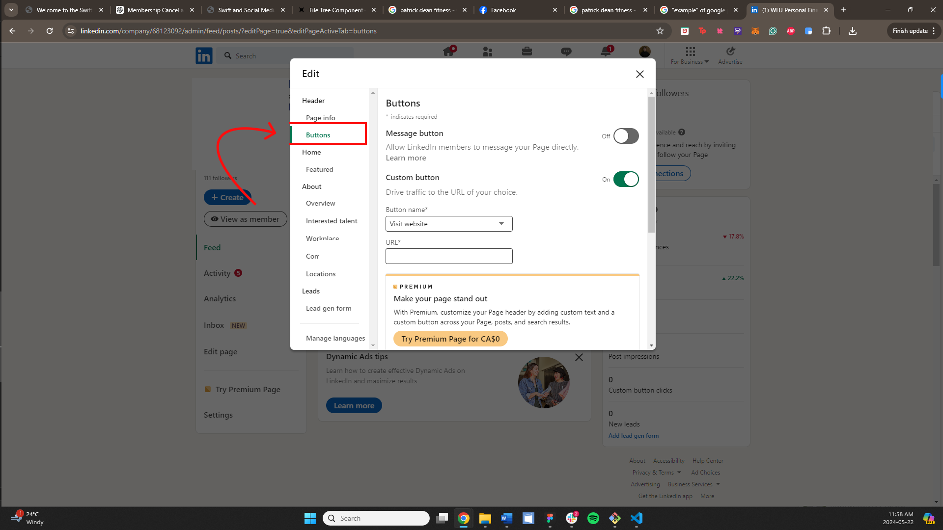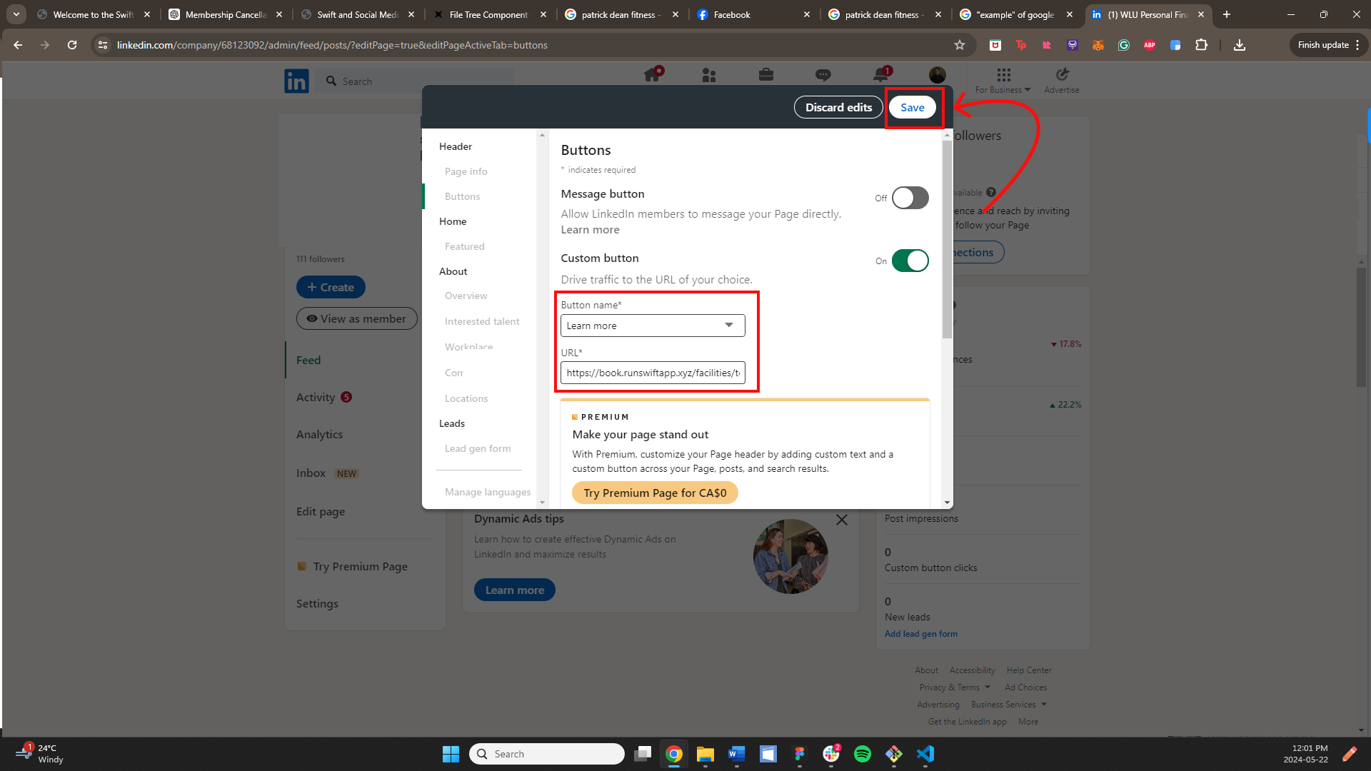 Select a button name from the dropdown options, then navigate to your Swift homepage, and click "Copy public page link" in the bottom left corner. Paste this link into the URL box on LinkedIn, then click the white "Save" button in the top right corner.