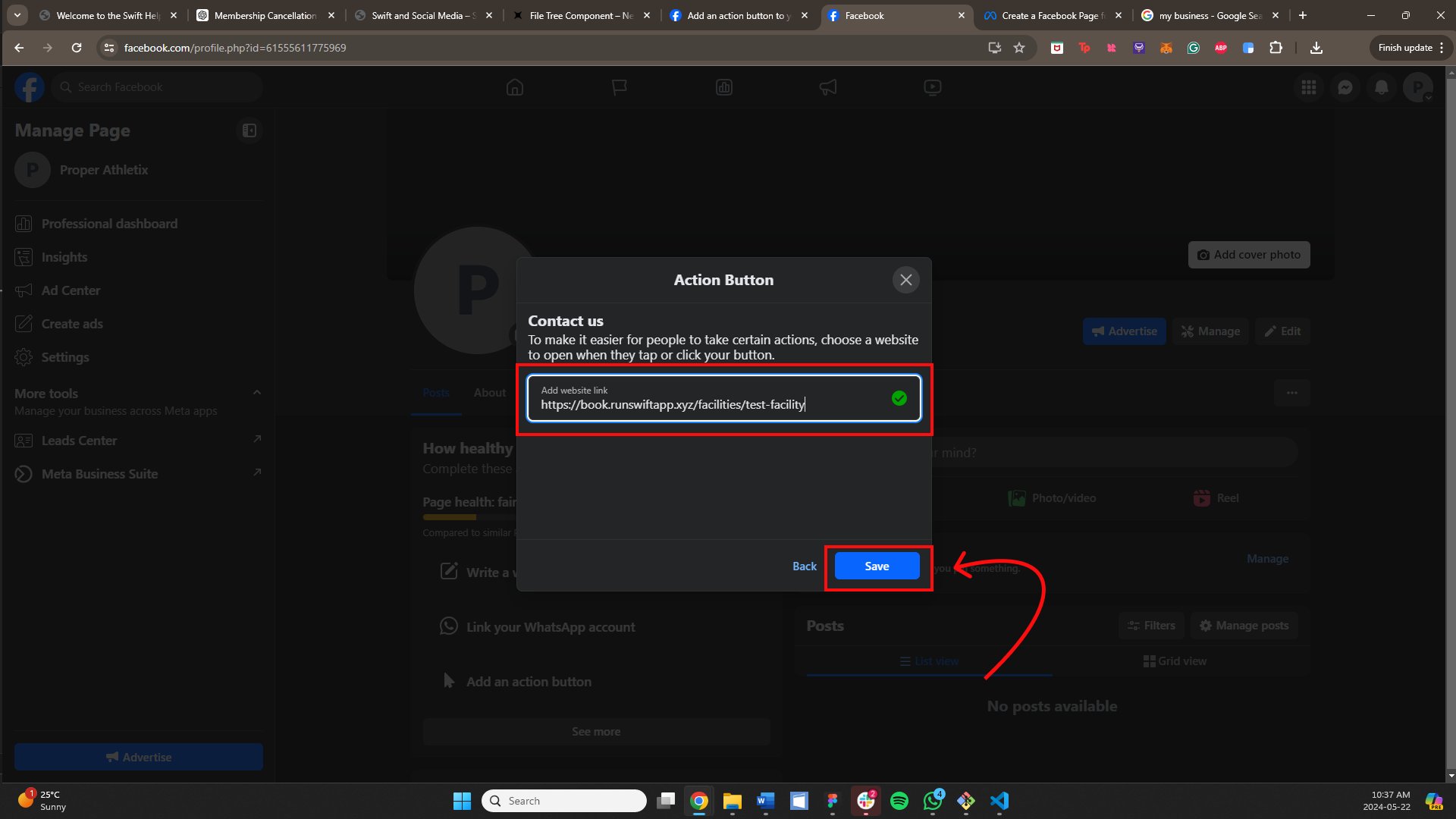 Navigate to the bottom left corner of your Swift account and click "Copy public page link." Then paste the page into the website link field on Facebook and click the blue "Save" button.