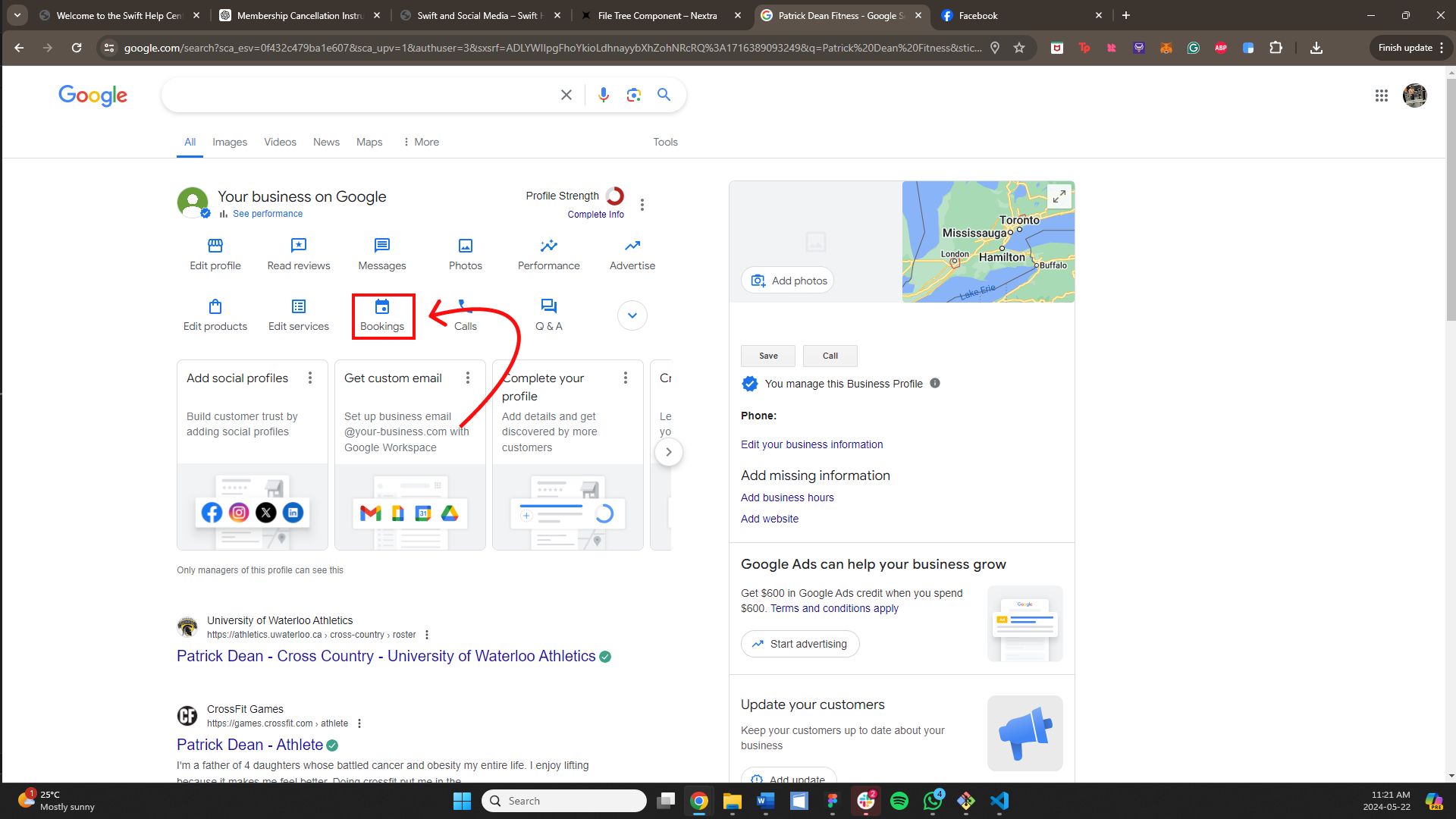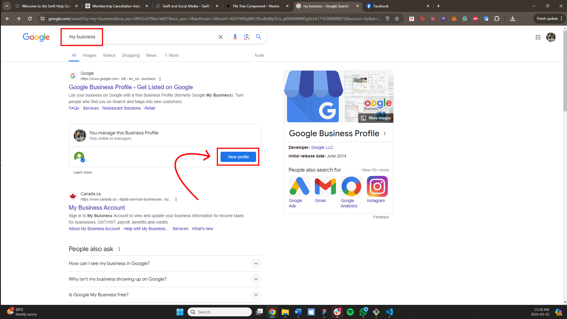 To add Swift to your Google Business Profile, first search "my business" on Google. This will pull up the options that you have to customize your profile, as well as a small preview of how it currently looks.