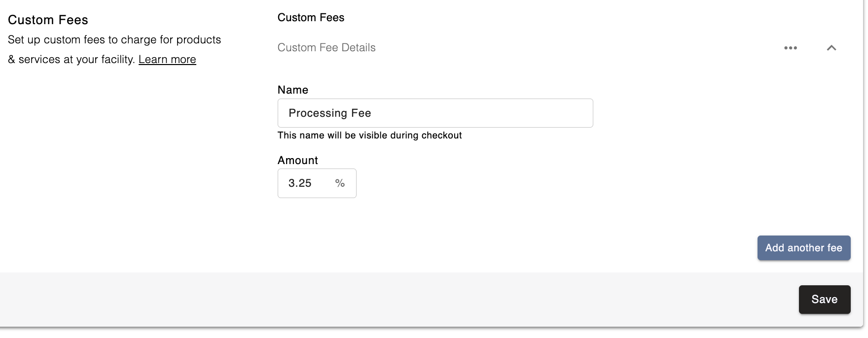 To edit an existing custom fee, simply expand the fee you're looking to edit and update the name or amount as needed. Once you hit Save, all future transactions will reflect the updated fee.