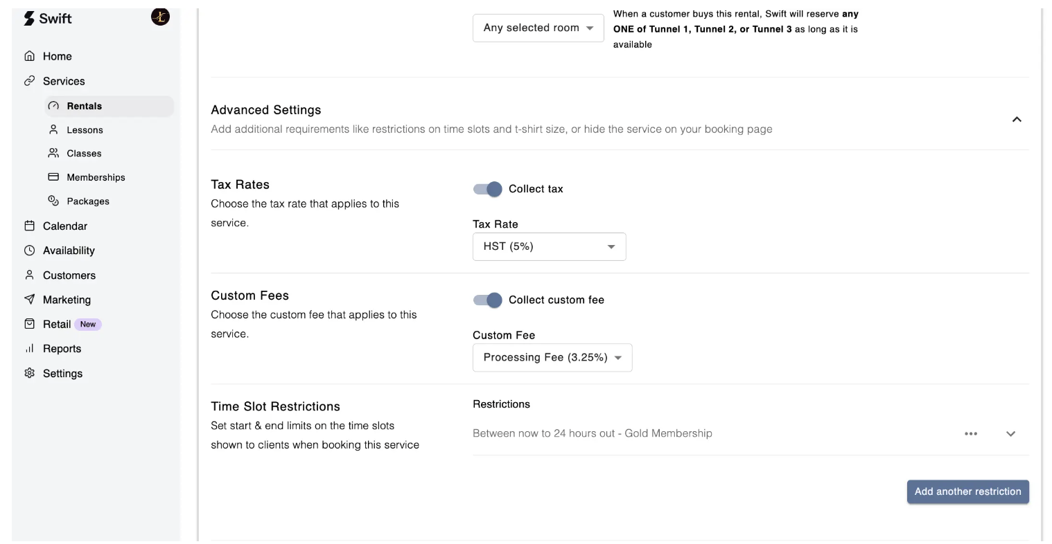 Go to the Service Page for the item you want to apply tax to (e.g., rentals, lessons, memberships).