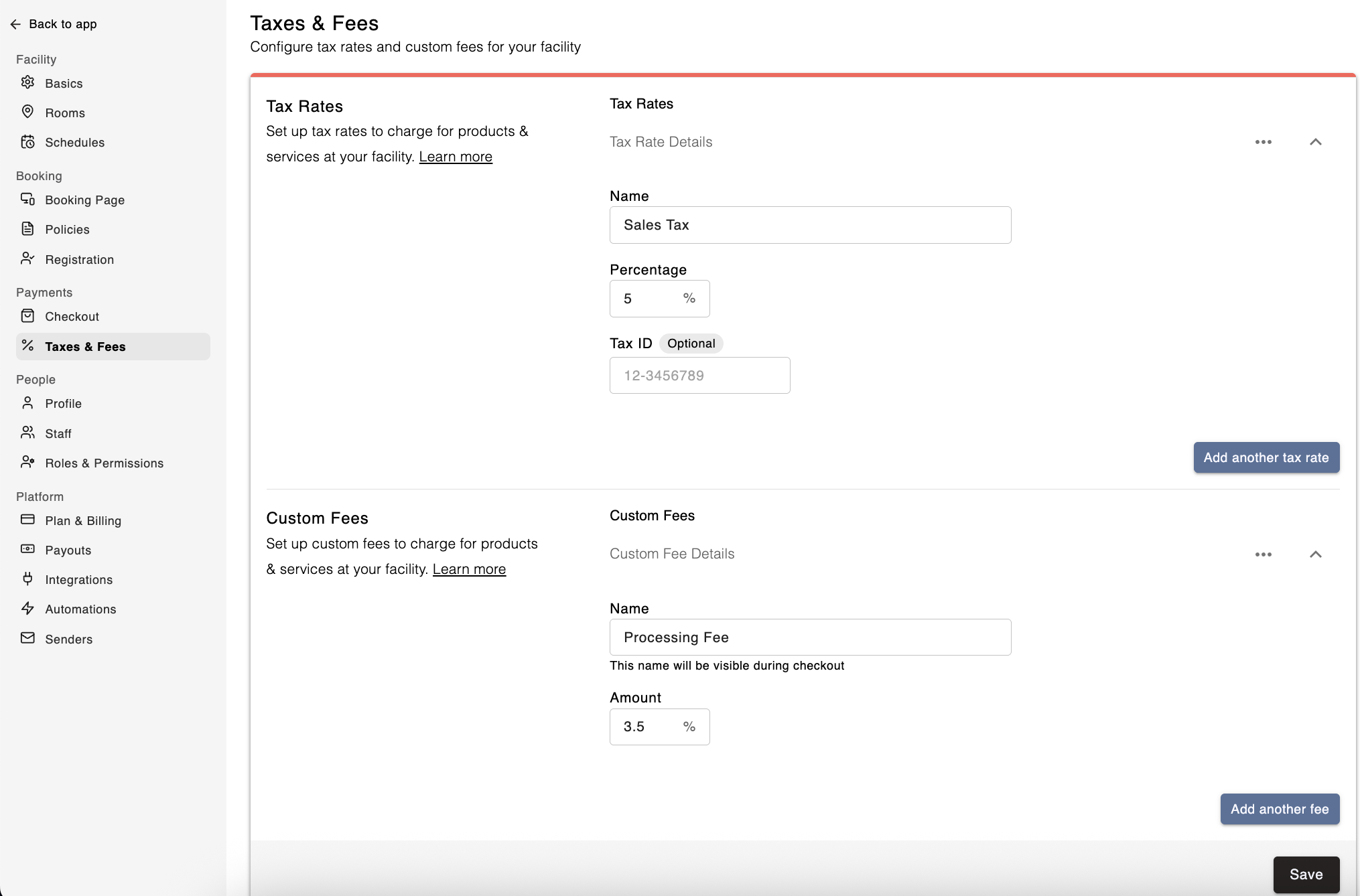 You can collect tax on your services and products by setting up tax rates in your facility settings. Follow these steps to configure tax rates: