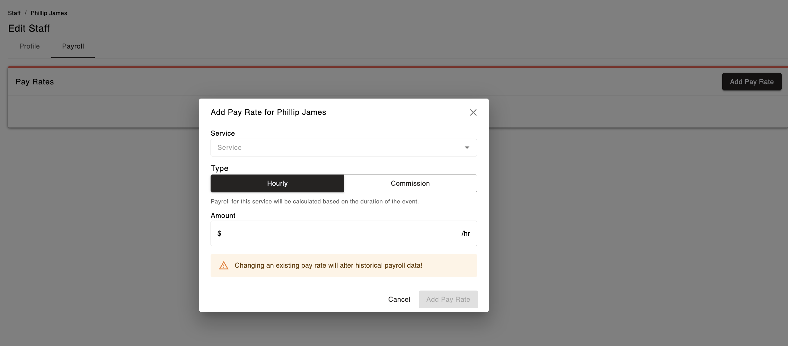Once you've set these two options, click the "Add Pay Rate" button in the bottom right corner of the pop-up modal to save the pay rate.