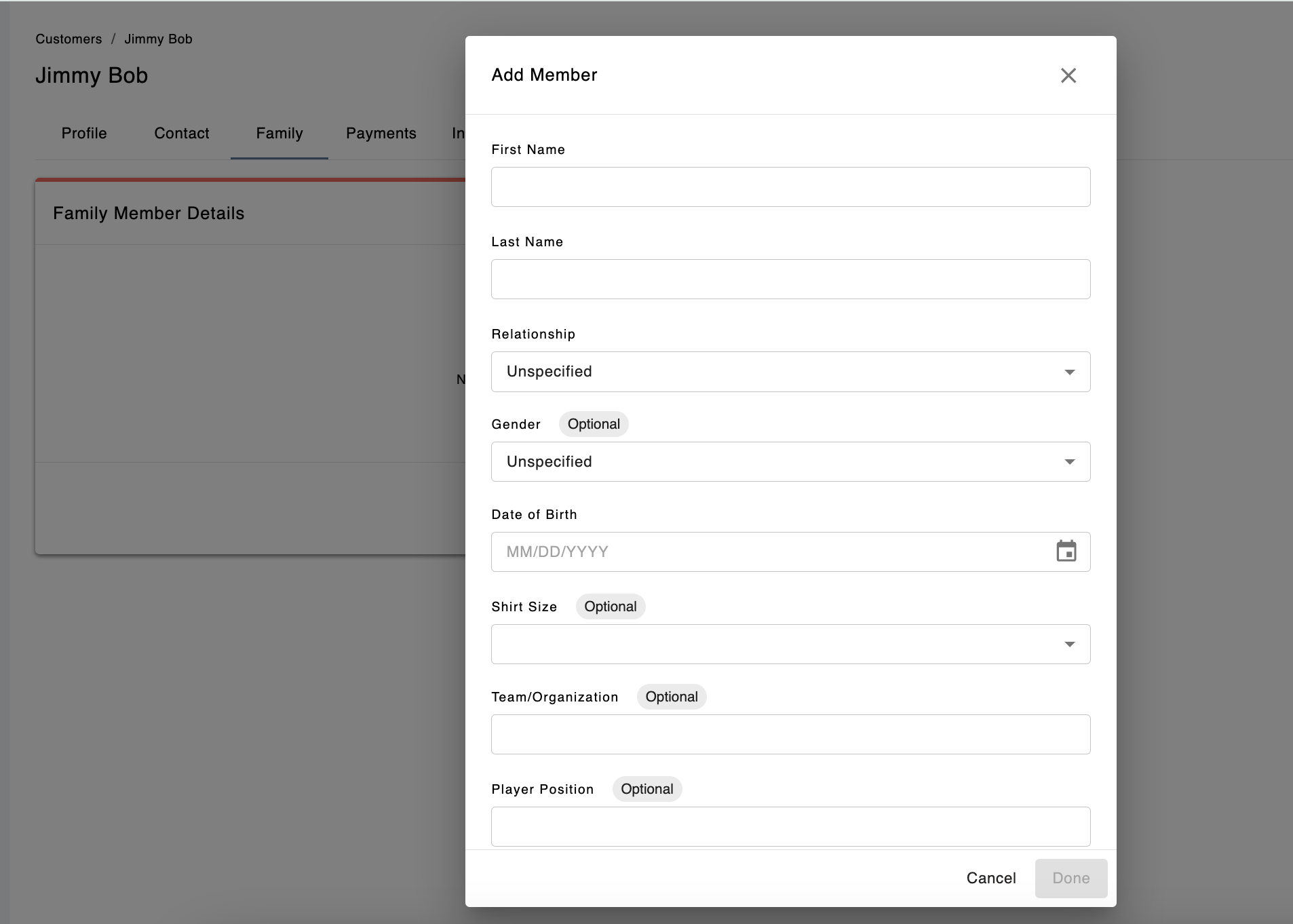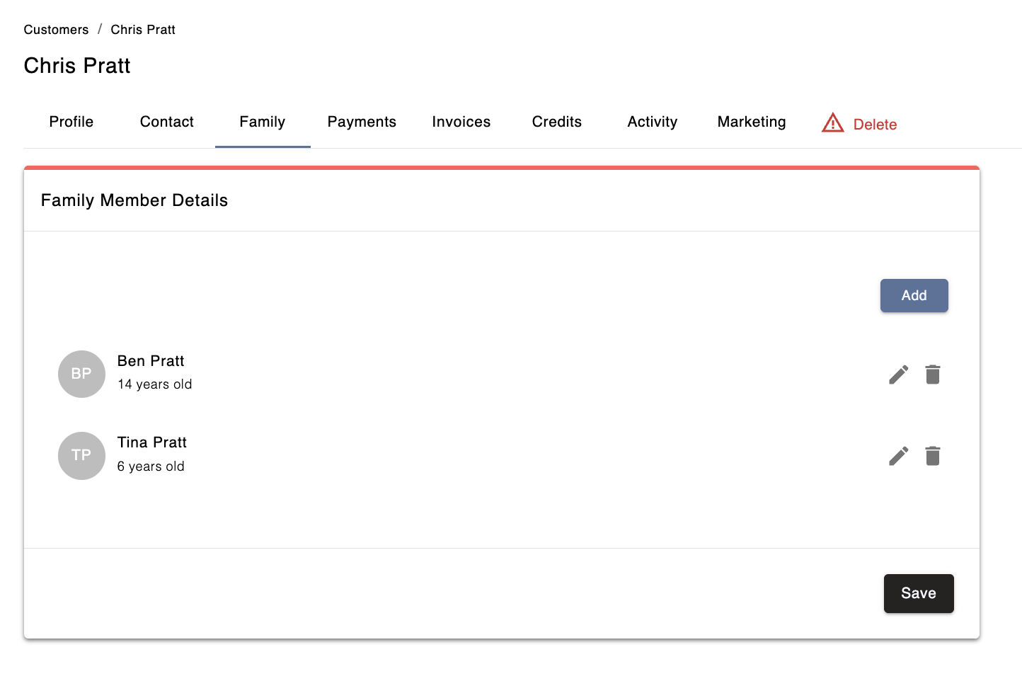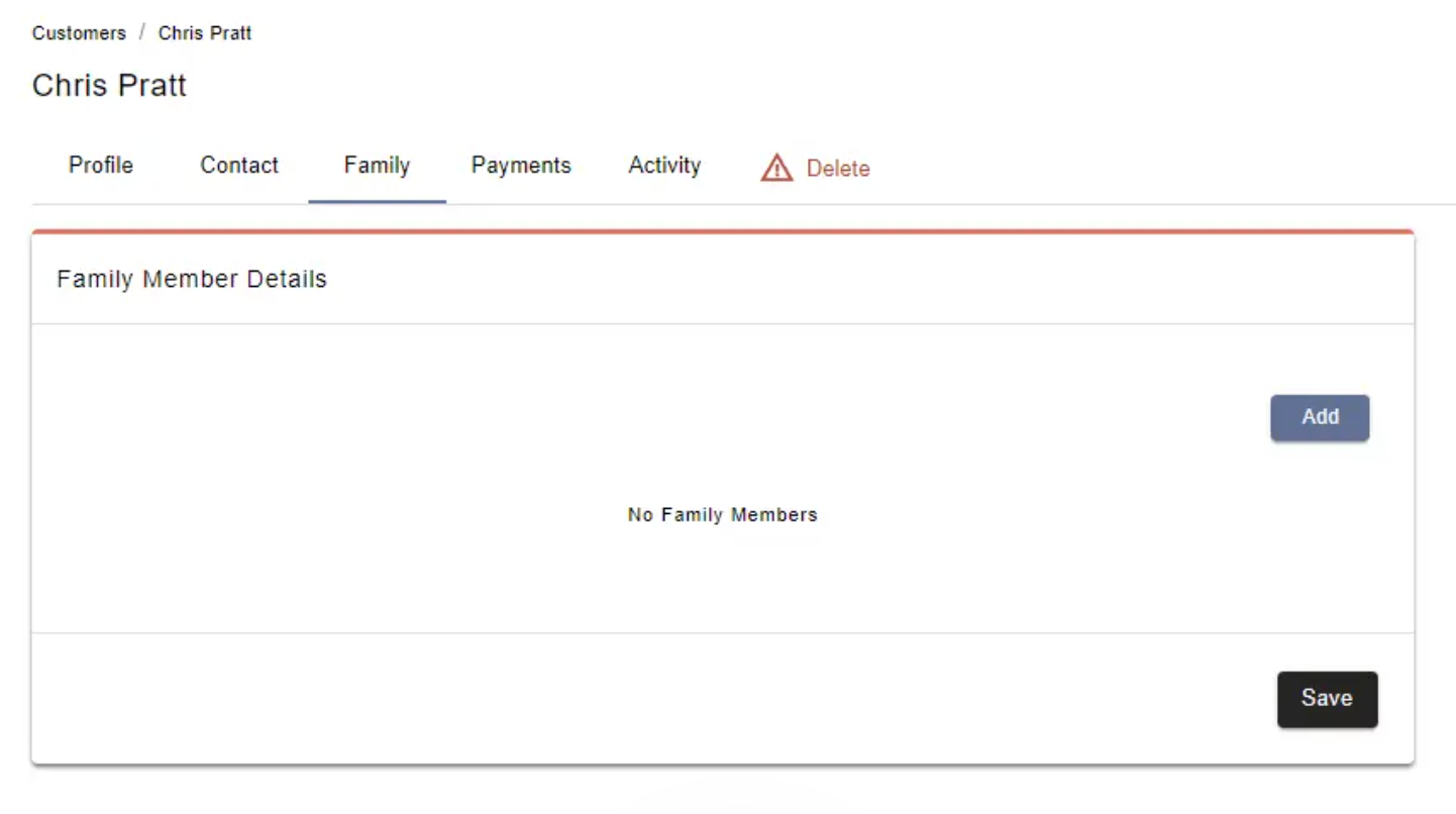 You can manage a customer’s family members directly from their profile in Admin. Each customer account can have up to 10 family members listed. This setup allows the main account holder to manage bookings, schedules, and payments for all listed family members from a single account.