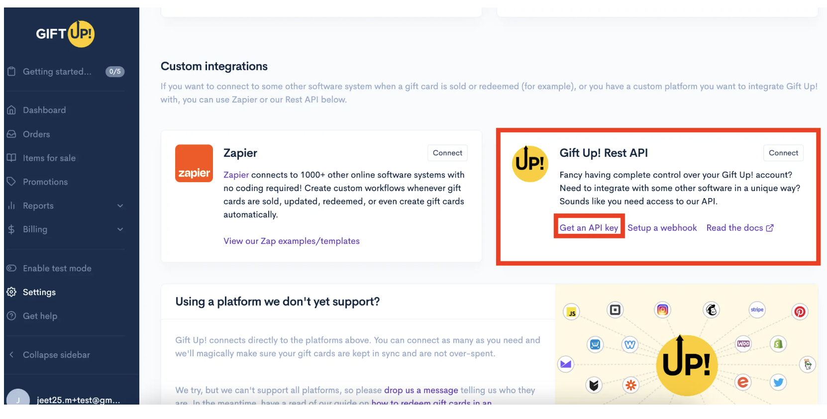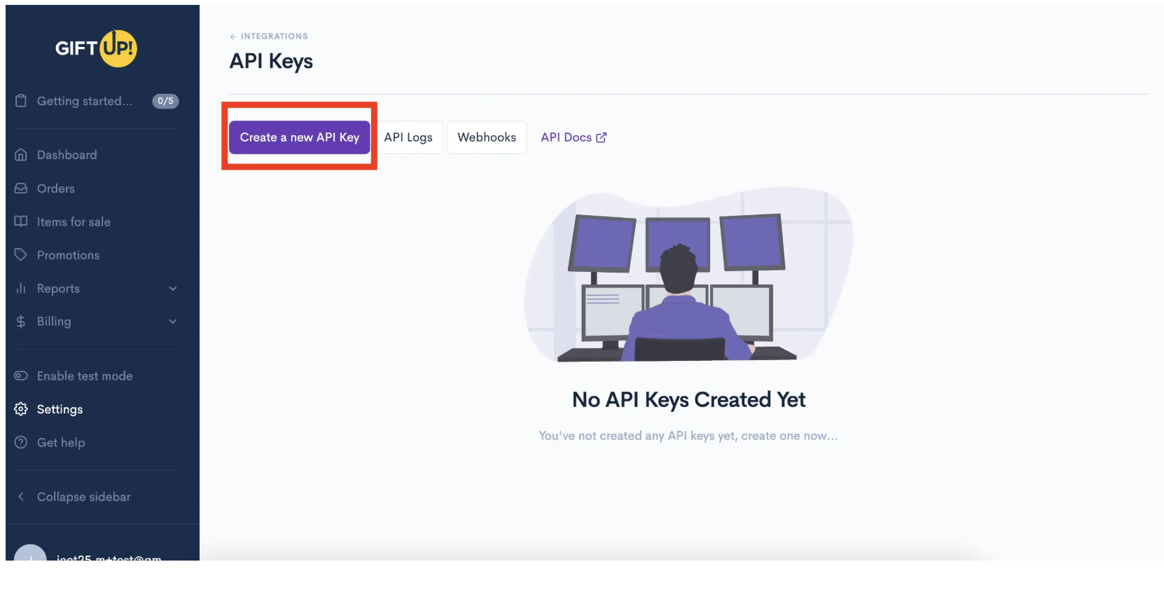 Scroll all the way down to the "GiftUp! Rest API" card, and click on "Get an API key" to go the API keys page.