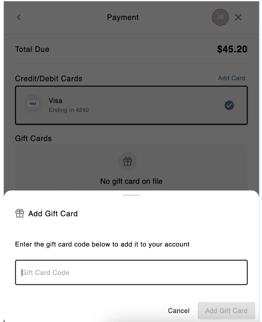 Simply click "Add Gift Card" and a modal will pop up to enter the code.