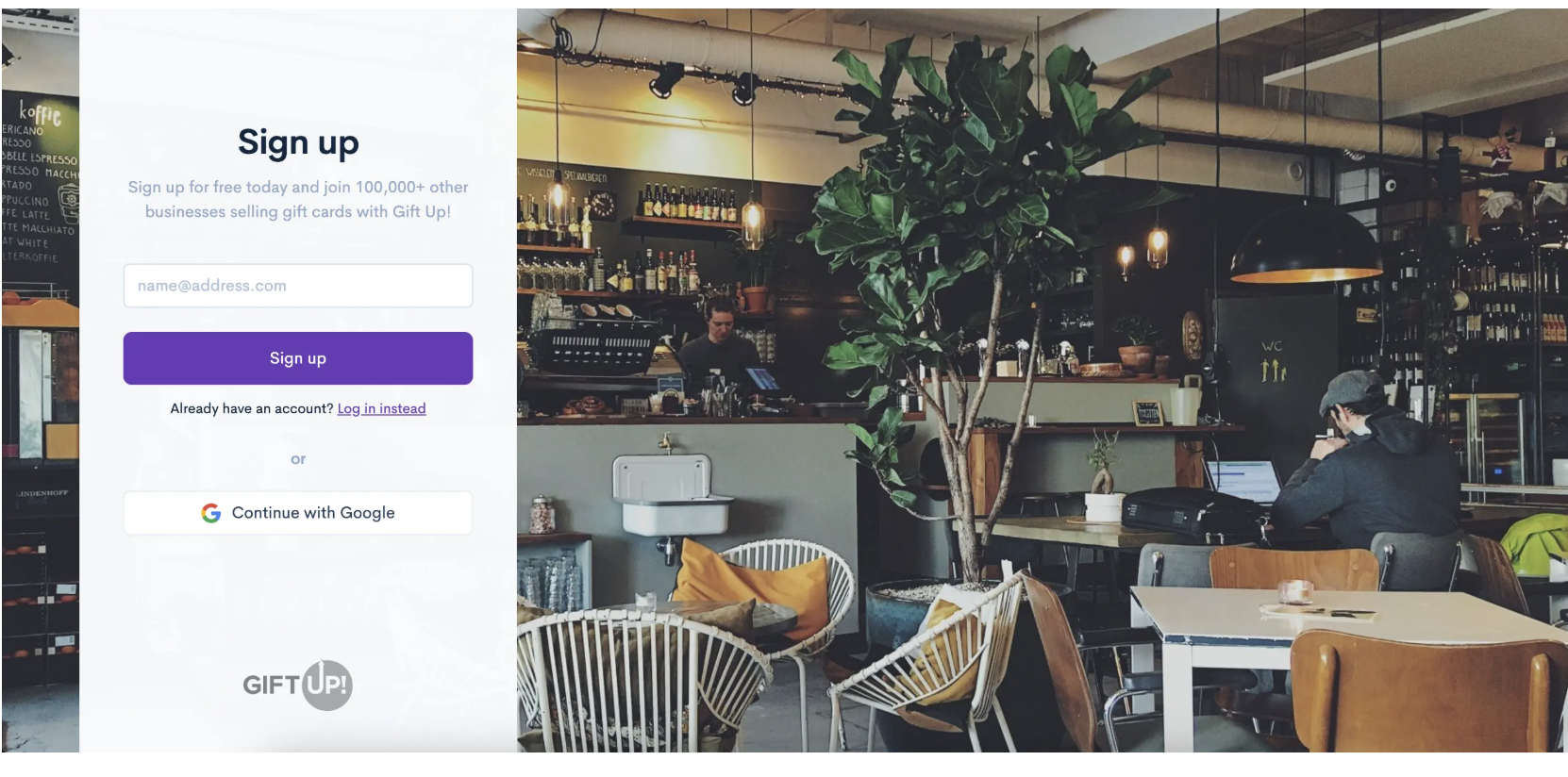 Start by creating your free GiftUp account. Visit the GiftUp home page and click "Sign Up". There, you'll be asked to enter an email & password for your account. If you already have an account with GiftUp, click "Log In".