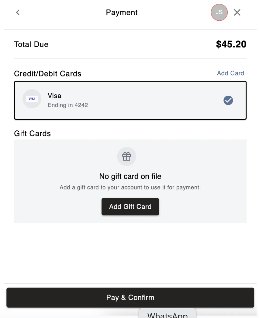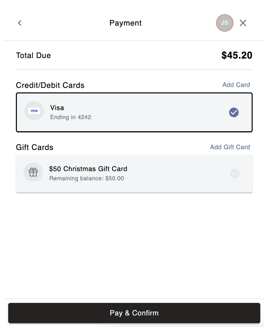 Once it's been added, the gift card will appear as a valid payment method. When the customer attempts to buy a service that exceeds the balance on the card, Swift will ensure they choose a backup payment method (ex: credit card) to pay the remainder.