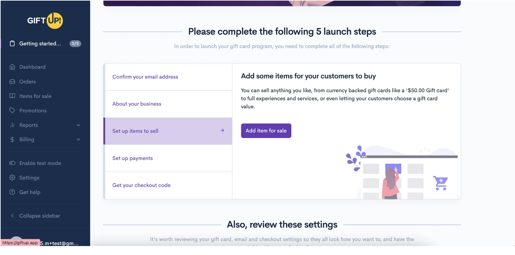 Once you've created your account, you'll get sent to the GiftUp admin portal. Here, you'll see many setup steps like adding business details, connecting your Stripe account, etc. - but the one we'll focus on for now is creating an item for sale. Aka, your gift card!