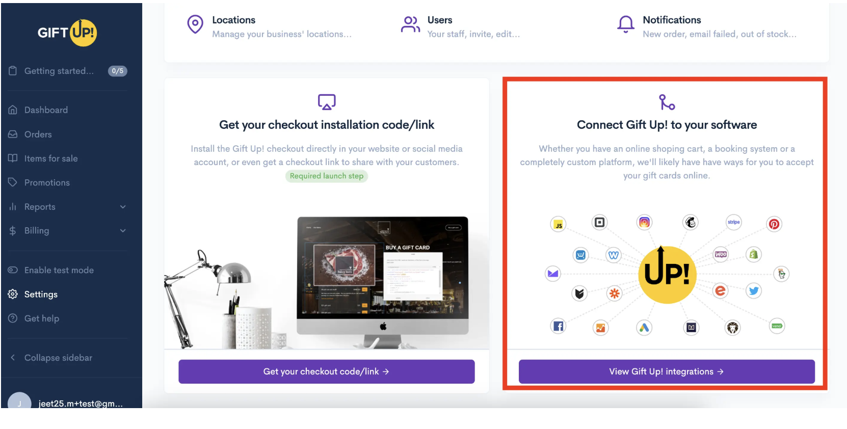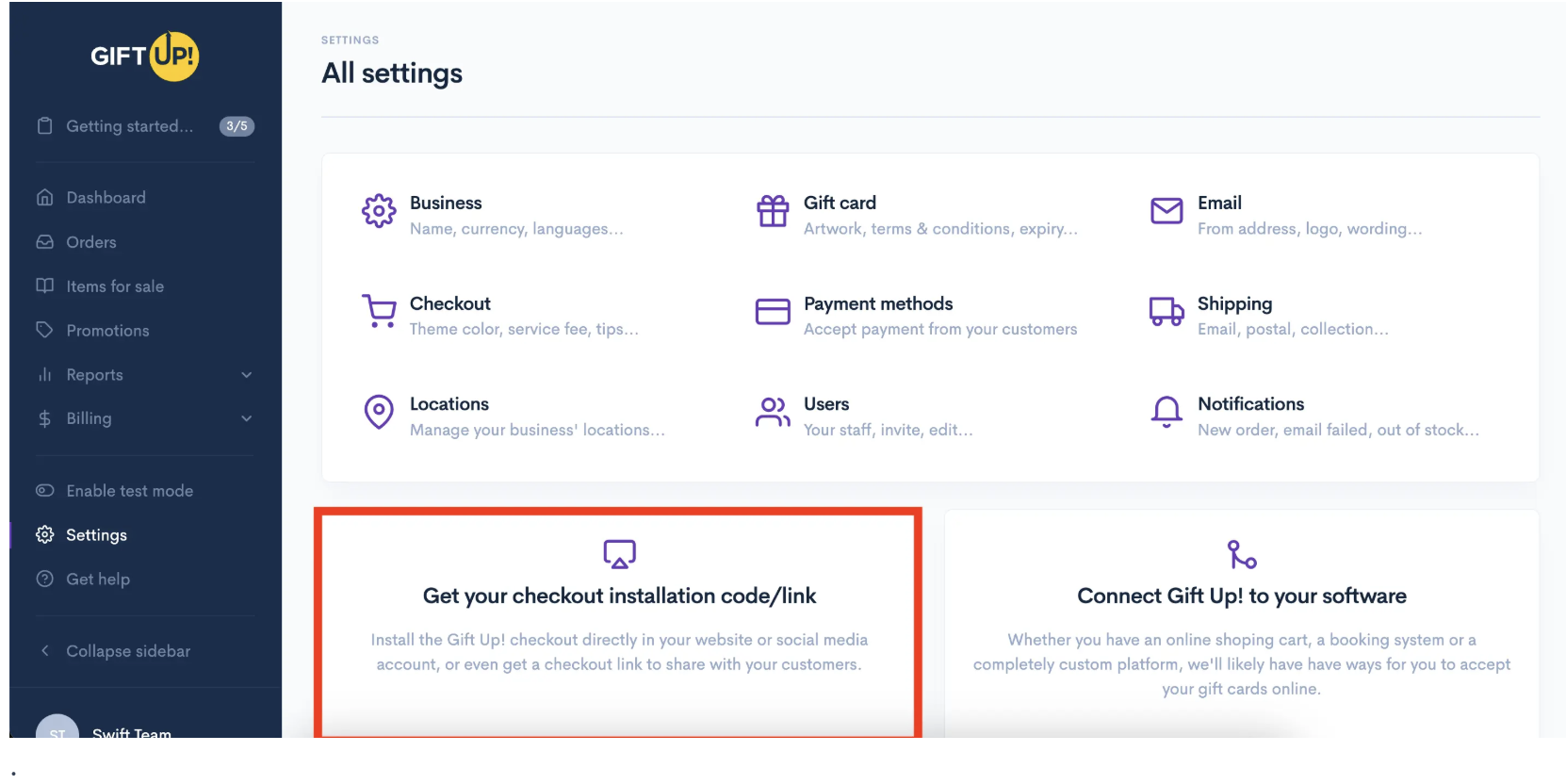 There are a few ways to do allow your customers to purchase your gift card. You can either send them your direct GiftUp checkout link or embed the checkout on your website. To do either of these things, you can visit the Settings page and click the "Get your checkout installation code/link" card.
