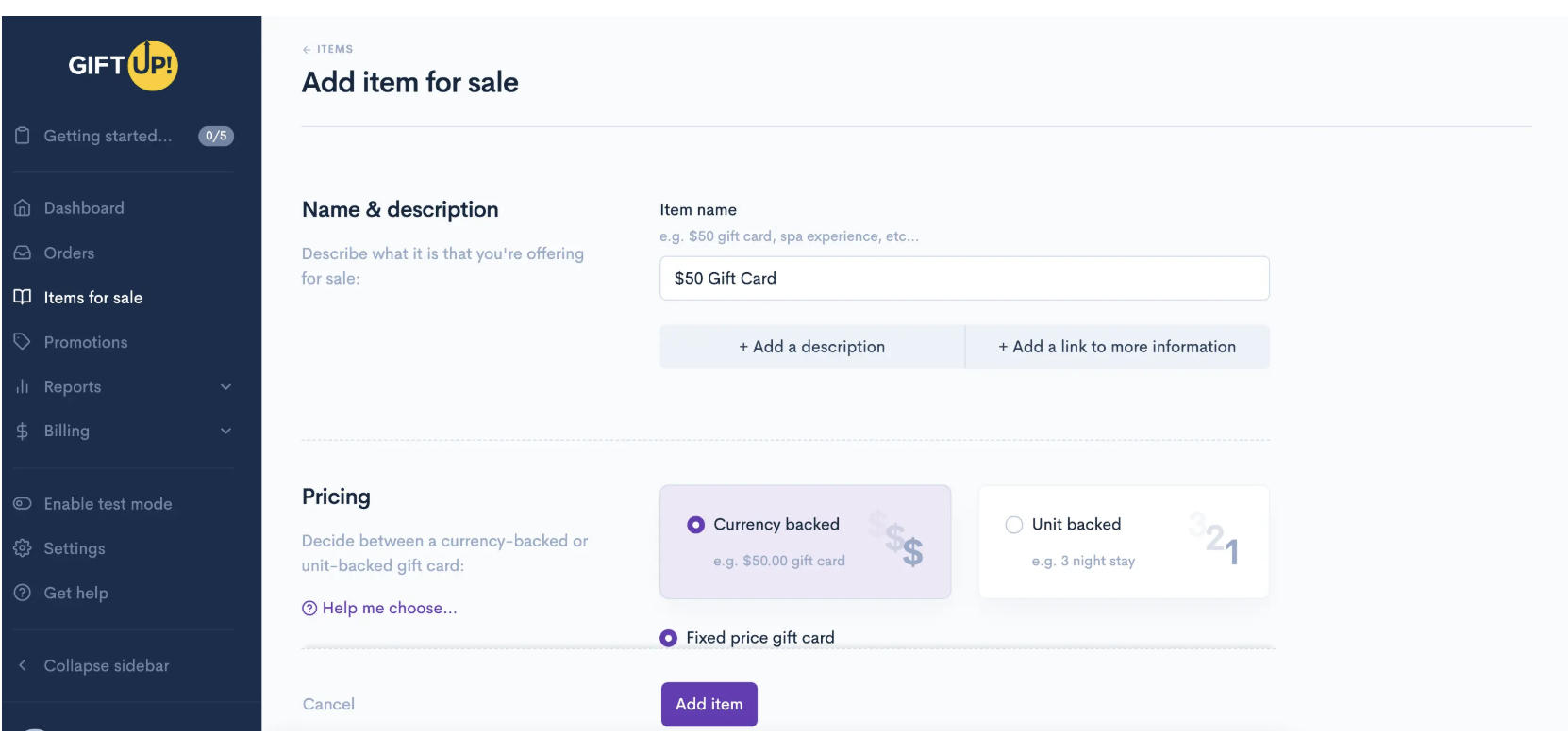 Here, you can enter a name, an optional description, and the price + value of the card. Once you're happy with the details, you can click "Add item" to create your first card!