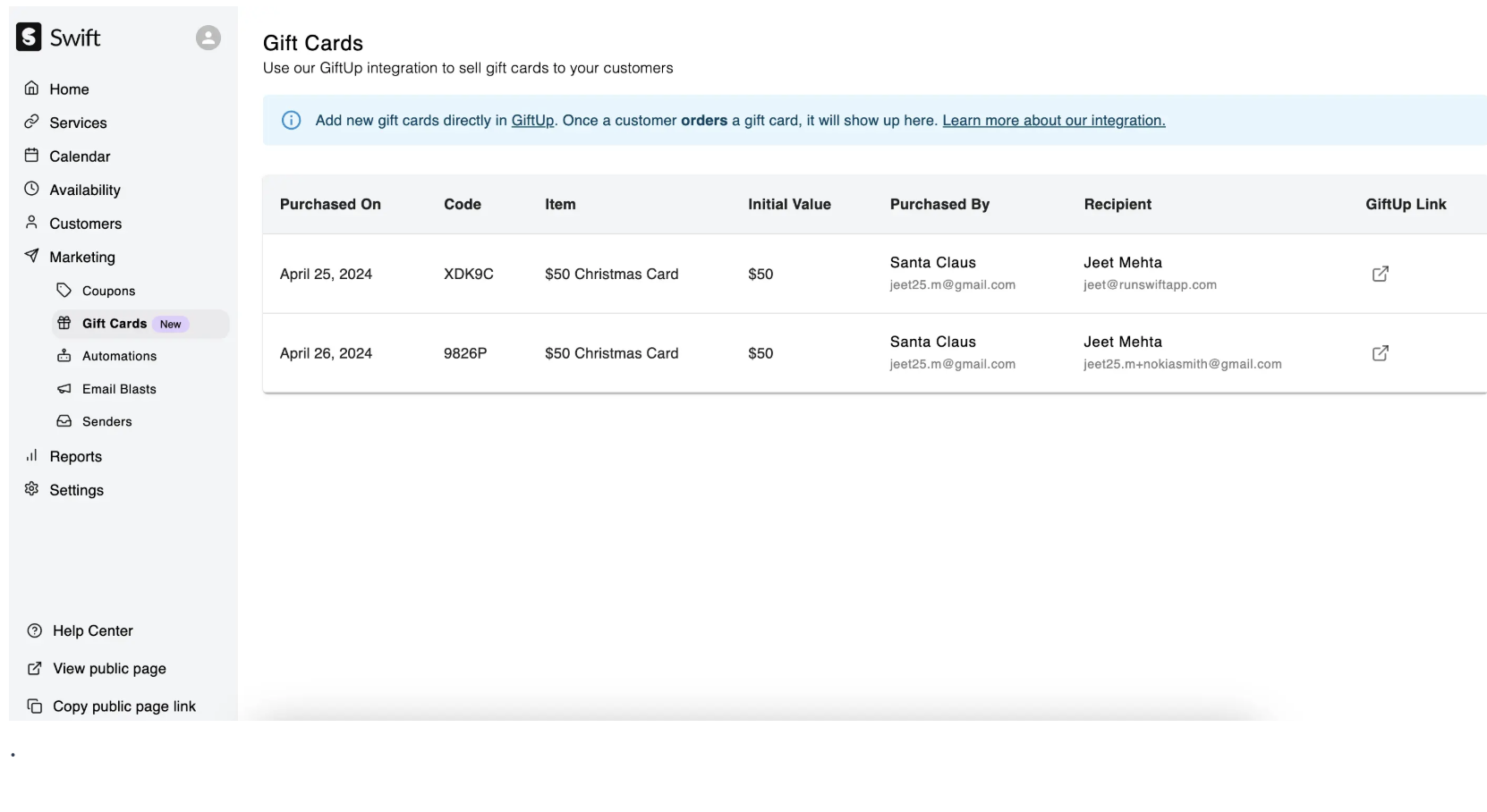 Once a customer buys a gift card from you, Swift will sync the order from GiftUp, and it will appear in the new "Gift Cards" page under Marketing.