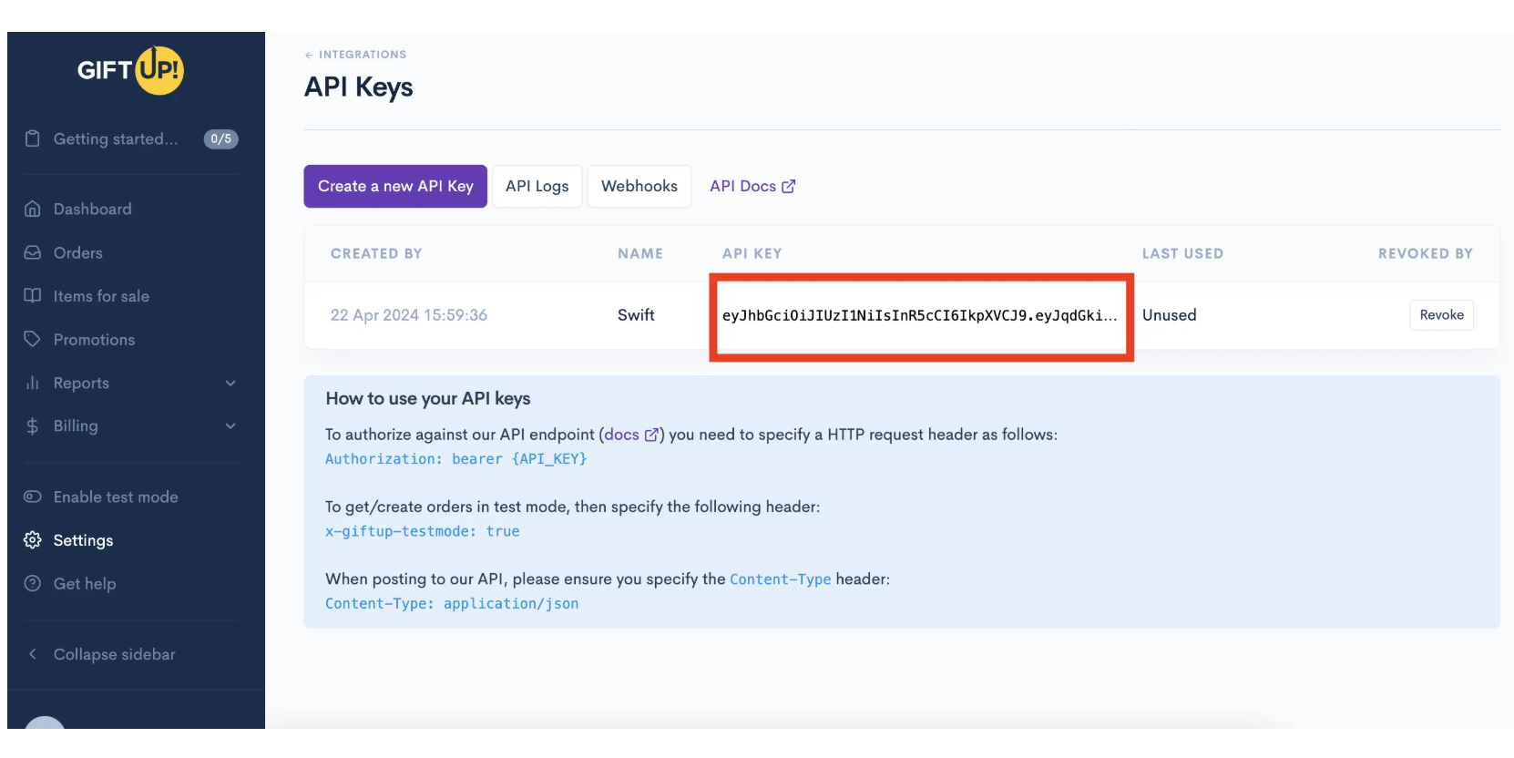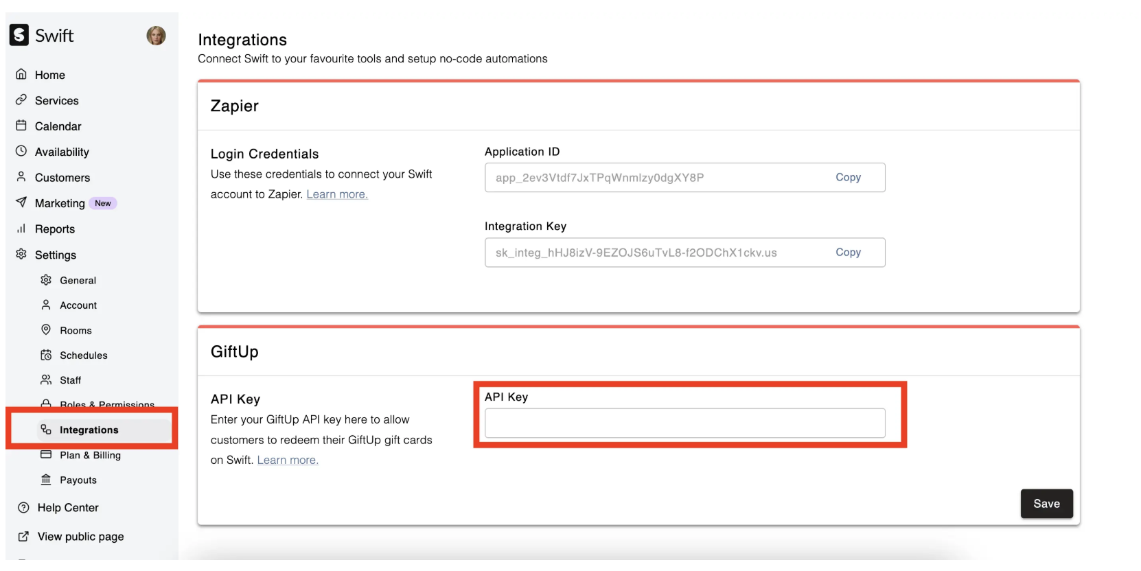 Once you've created your API key, you can now visit the Integrations page on Swift to connect your GiftUp account. If you don't have access to this page, ask an owner or staff member with appropriate permissions to do this.