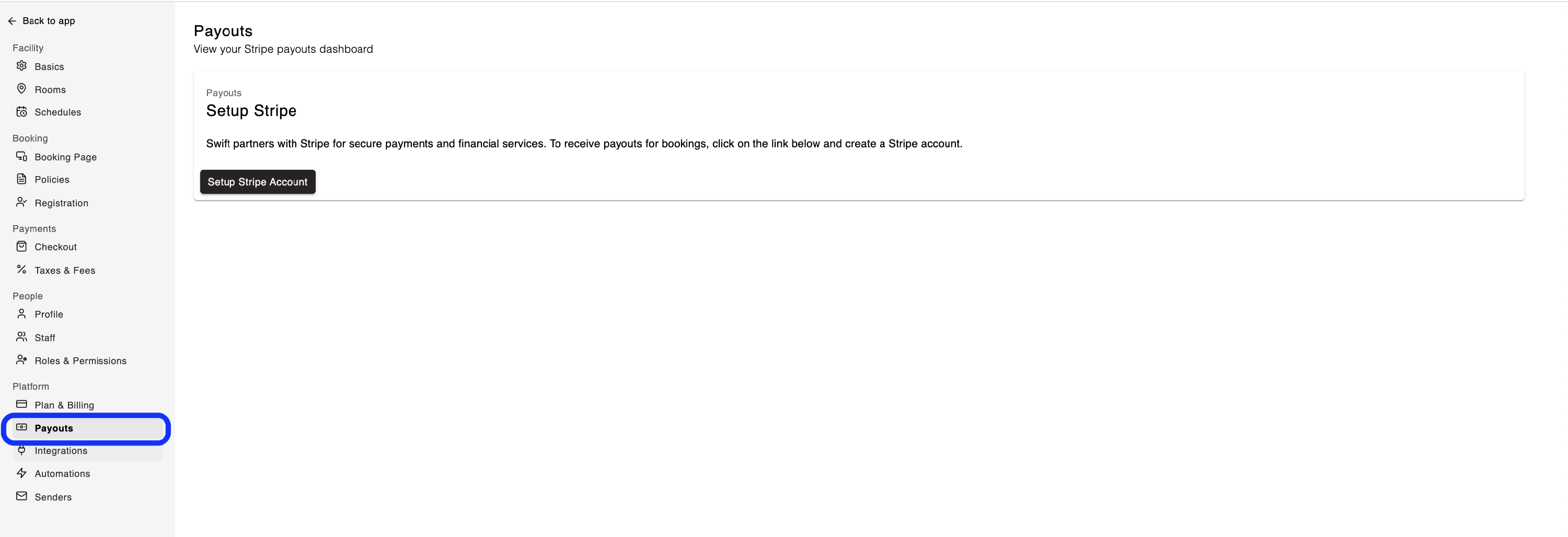 The Payouts page in Swift provides an easy link to your Stripe account. You can visit it by navigating to Settings > Payouts,