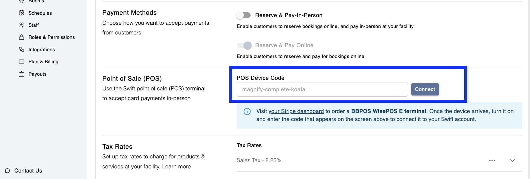 If you would like to collect card payments for in-person transactions, Swift currently only supports the BBPOS-WisePOSE terminal, provided by Stripe.