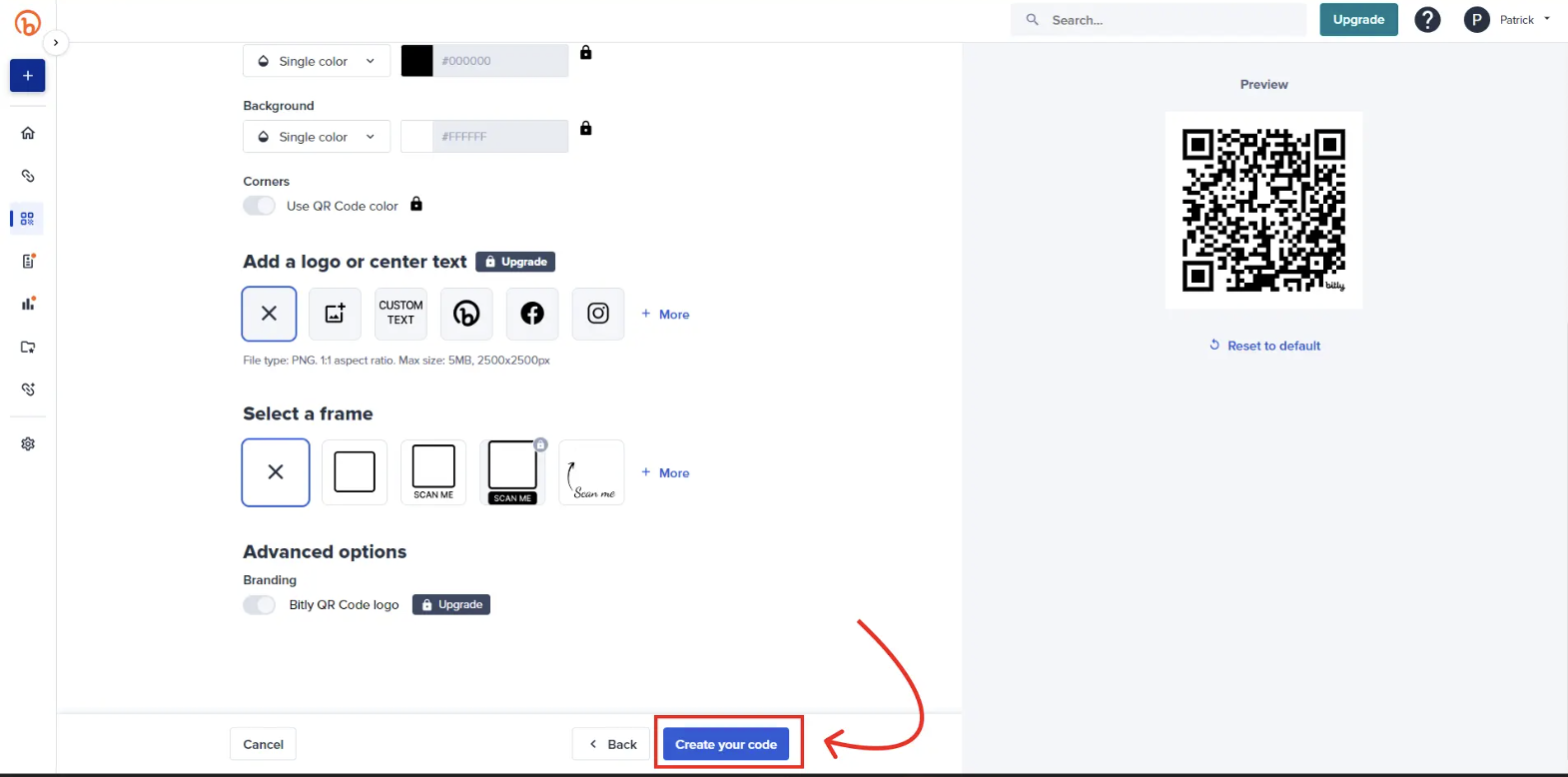 After clicking the blue "Design your code" button, you'll be sent to a second page with numerous design options. On the free plan, you can customize patterns, corners, colours, and frames. Once you're happy with your code, click the blue "Create your code" button in the bottom right corner.