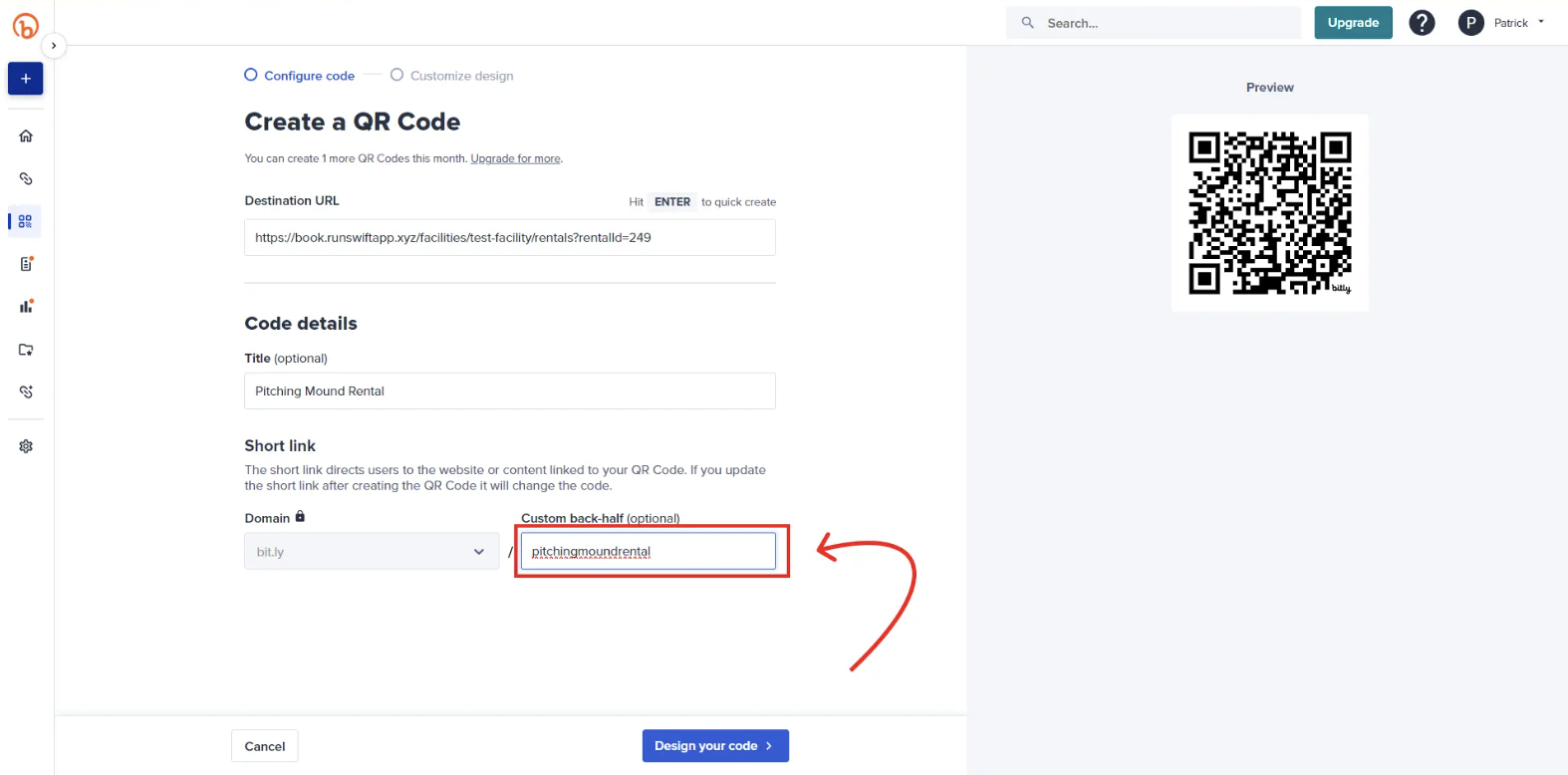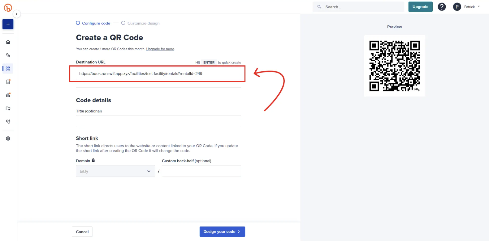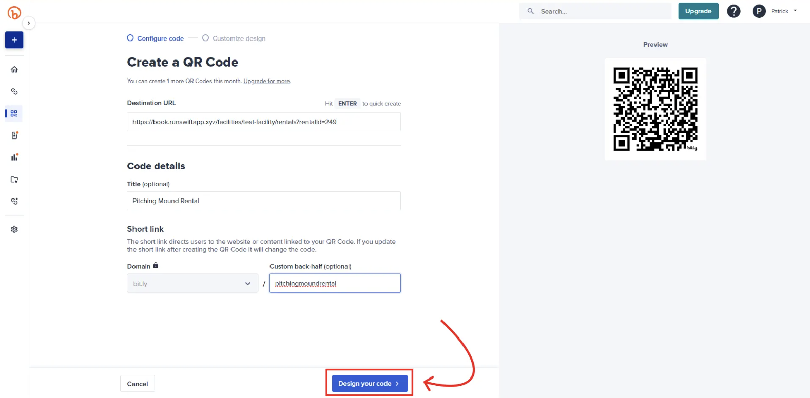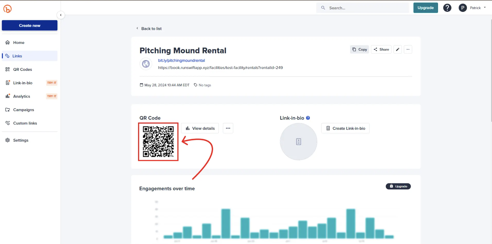 You can easily convert your facility’s booking link into a QR code using Bit.ly. Bitly’s free plan allows you to create up to 2 QR codes per month, making it a simple option for signage, front desks, or flyers.