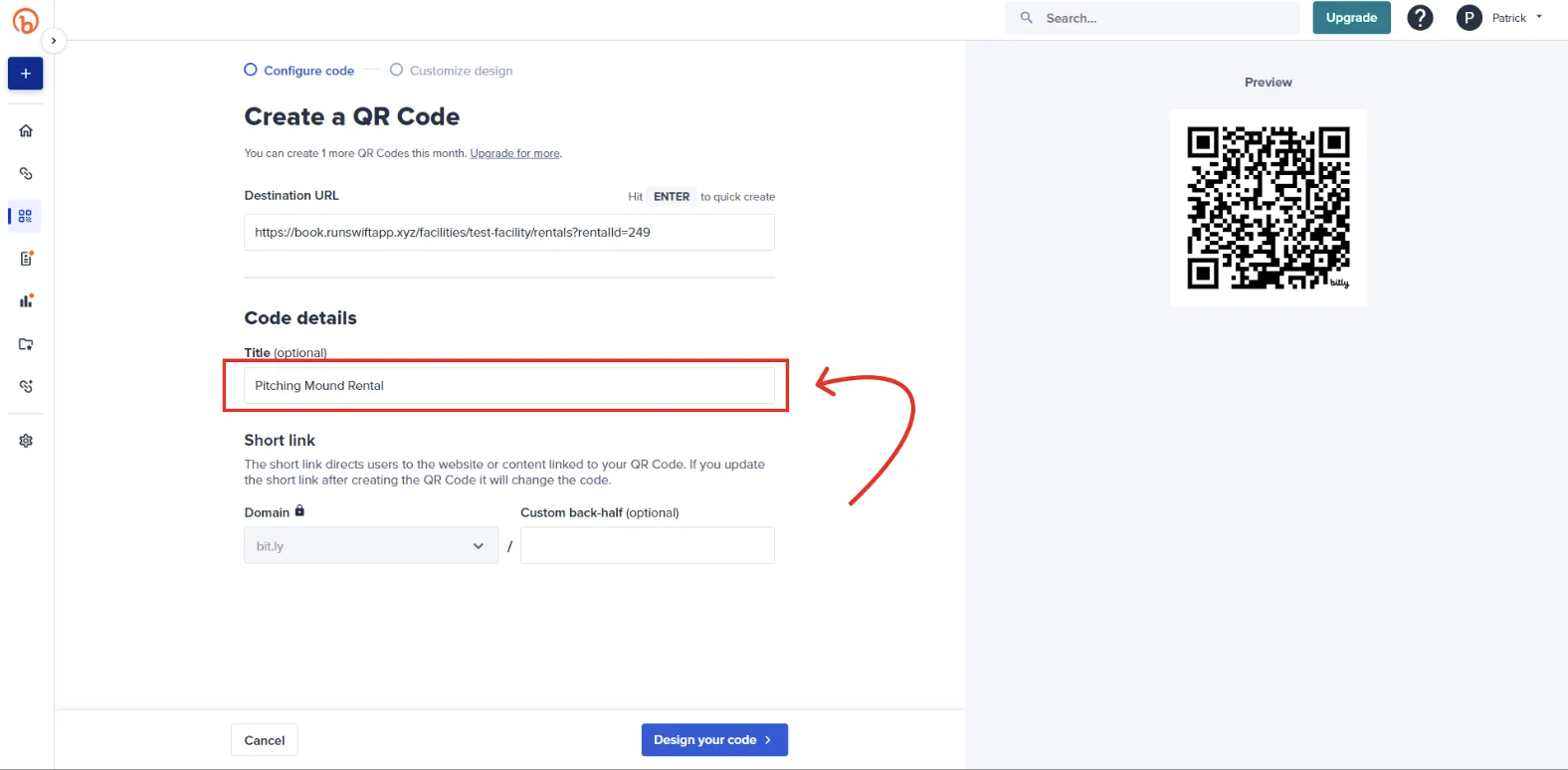 Give your QR code a title with the "Title" box just below the "Destination URL" box.
