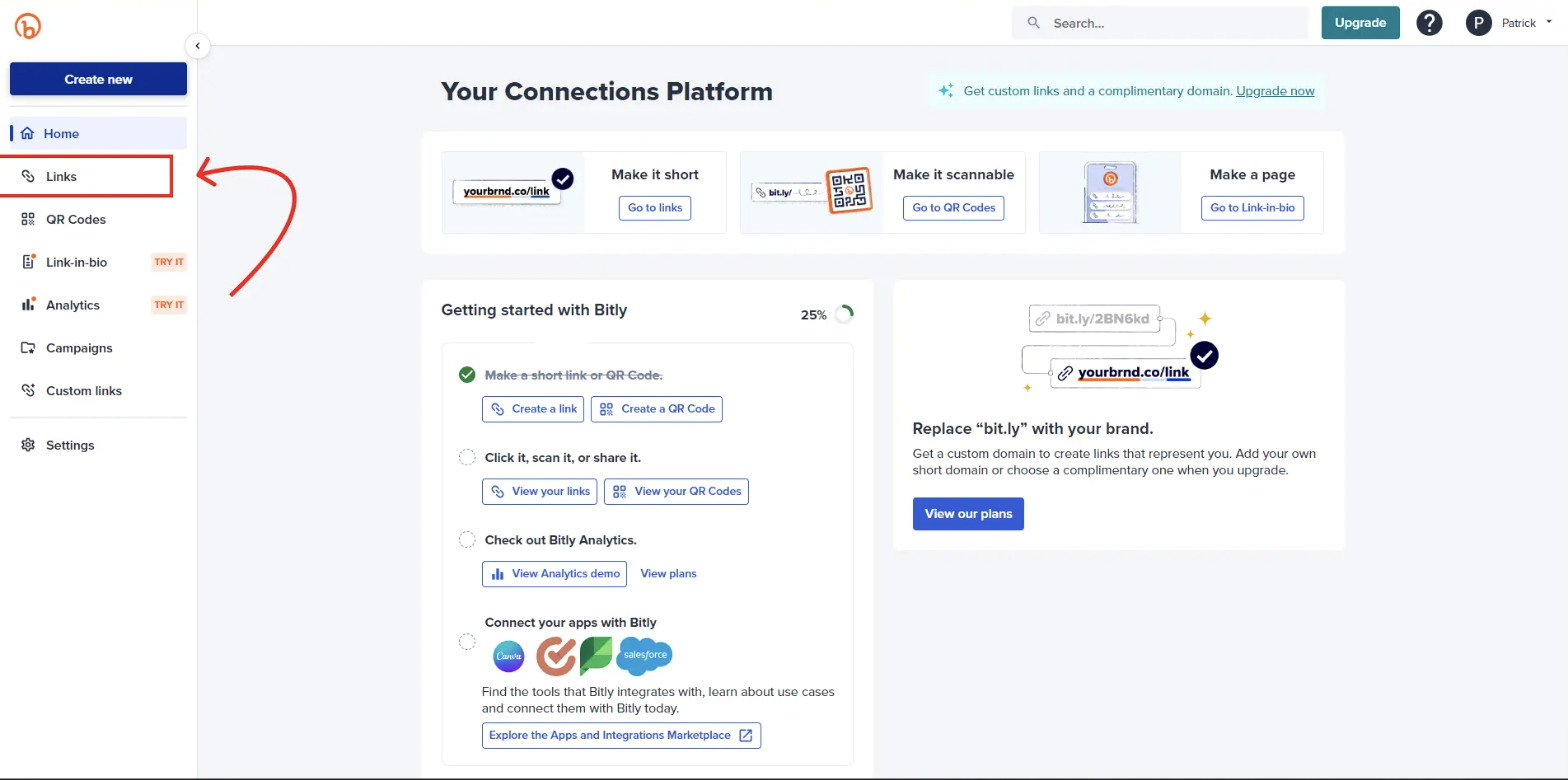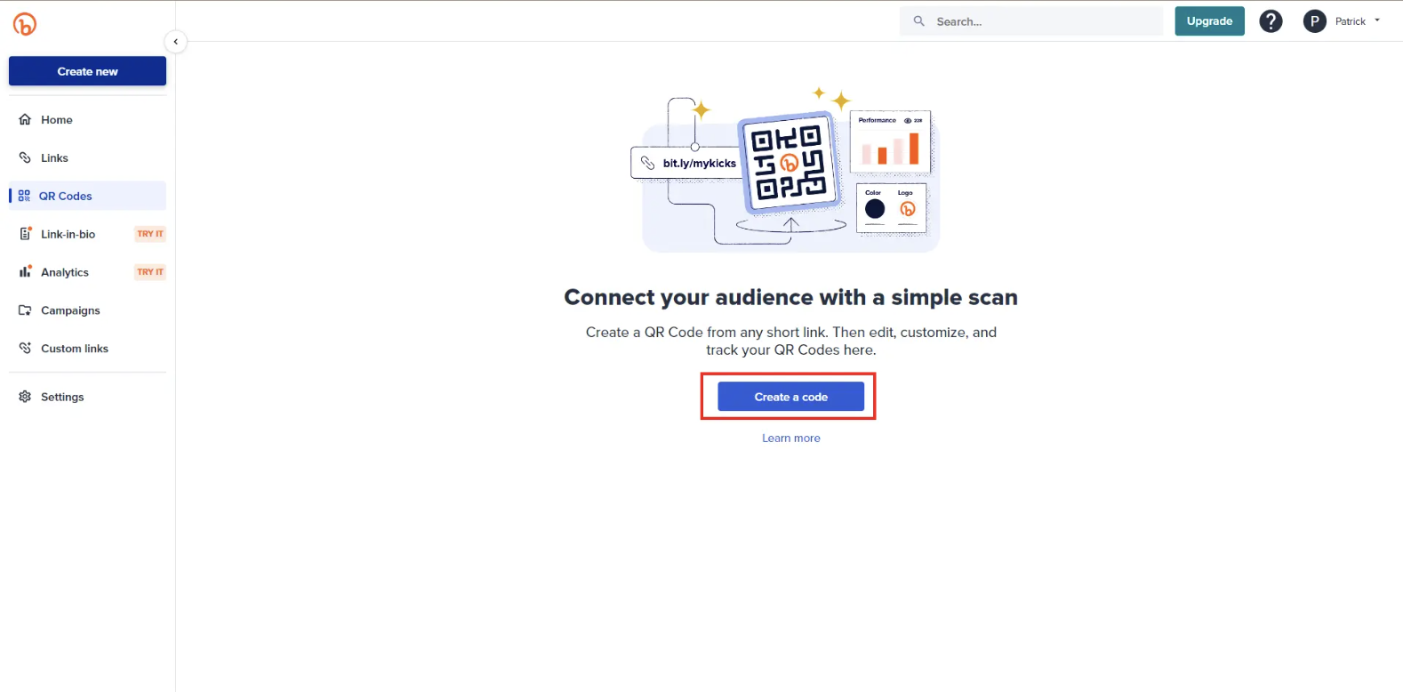 From the home screen in your Bitly account, navigate to the left of your screen and click on "QR Codes"