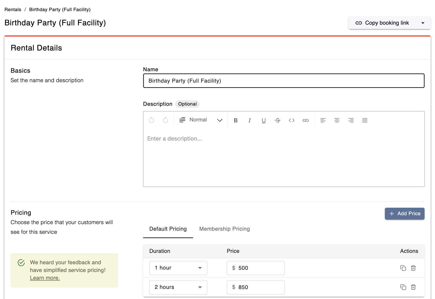 Go to the Birthday Party (Full Facility) rental in your Rentals services page
