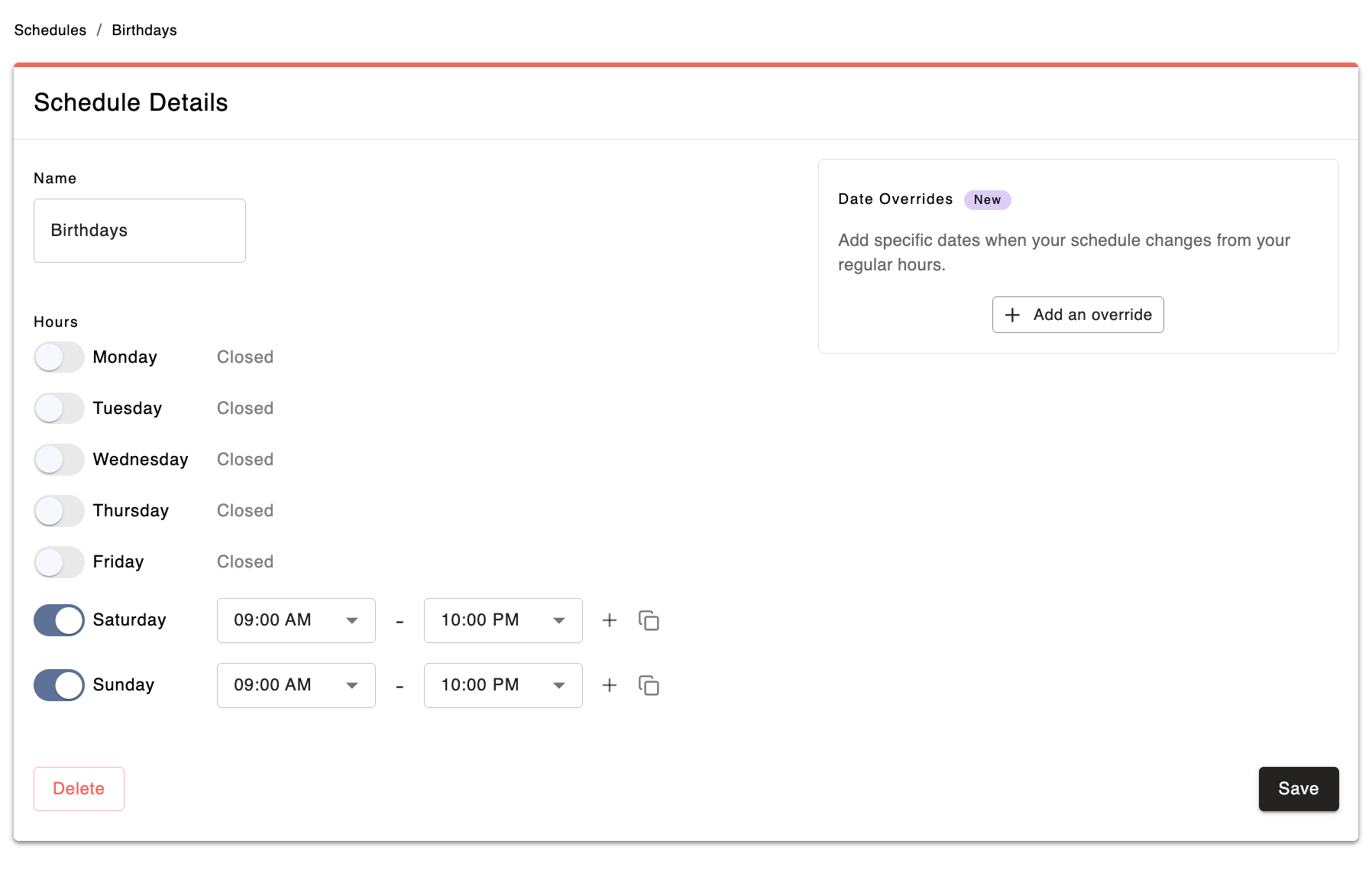 Create a new schedule that is open weekend only, when the birthday parties can take place
