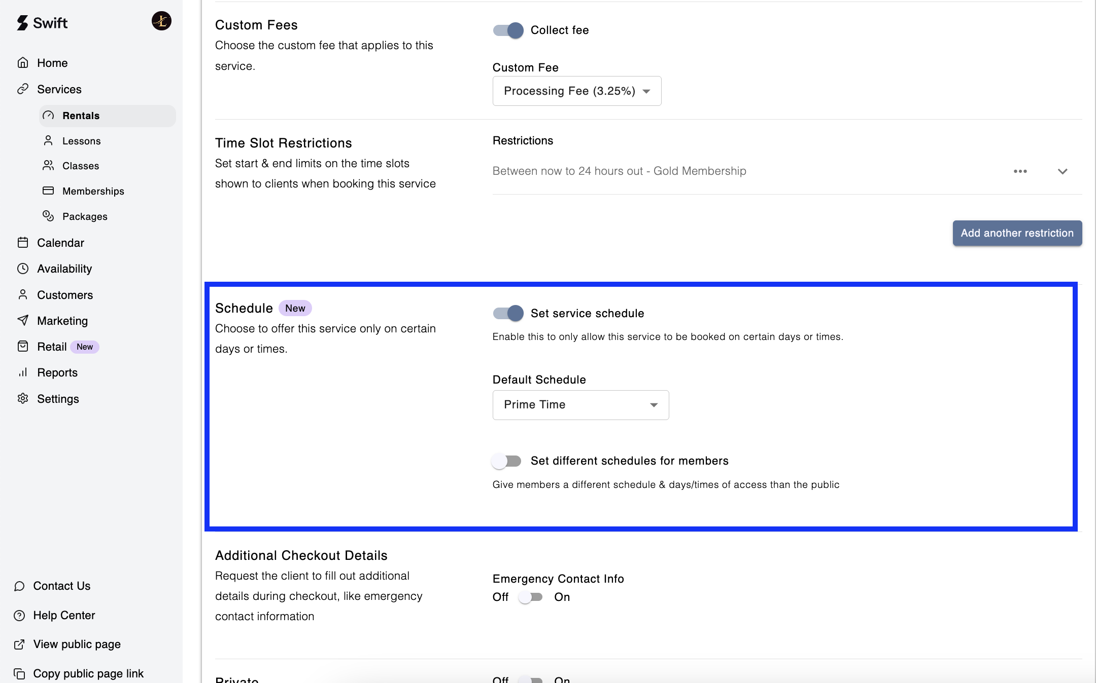 Service Schedule (or Time of Day Schedule) 🕒 lets you control when specific Rental services are available for booking.