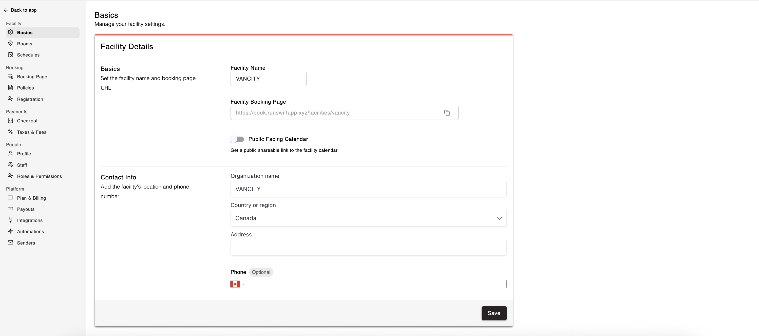 Update your facility’s name, address, contact info, and more. Details added here will appear on your public booking page. You can also access your public calendar URL to share with customers or embed on your website.