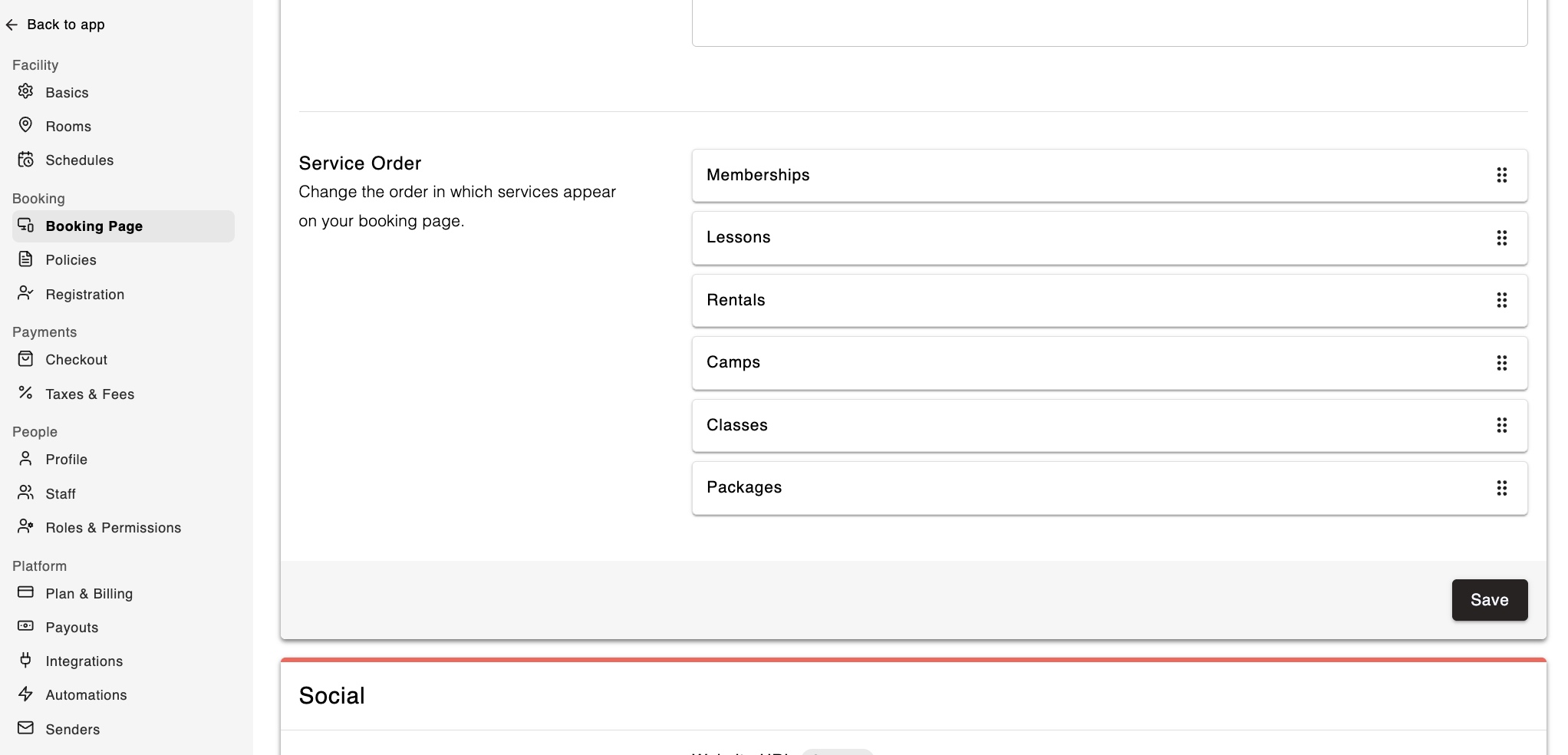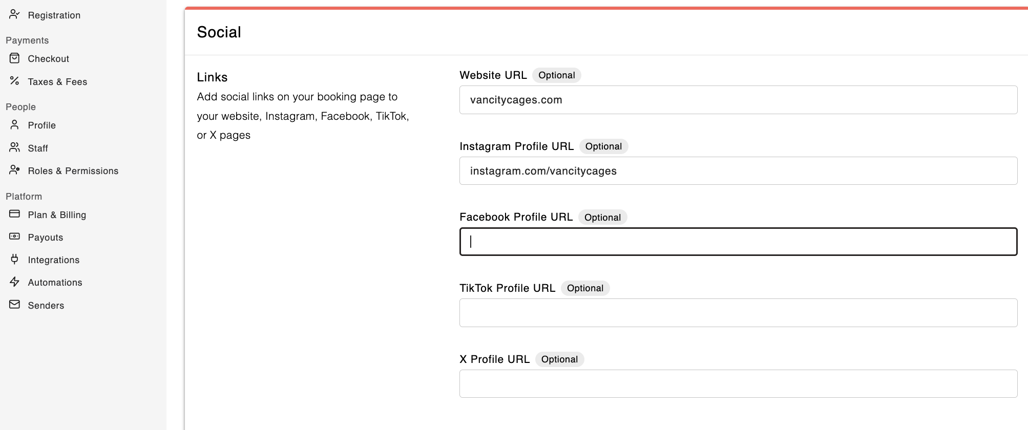 You can add your social media links to your facility profile. These will appear as clickable icons on your main booking page, making it easy for customers to connect with you on platforms like Instagram, Facebook, and more.