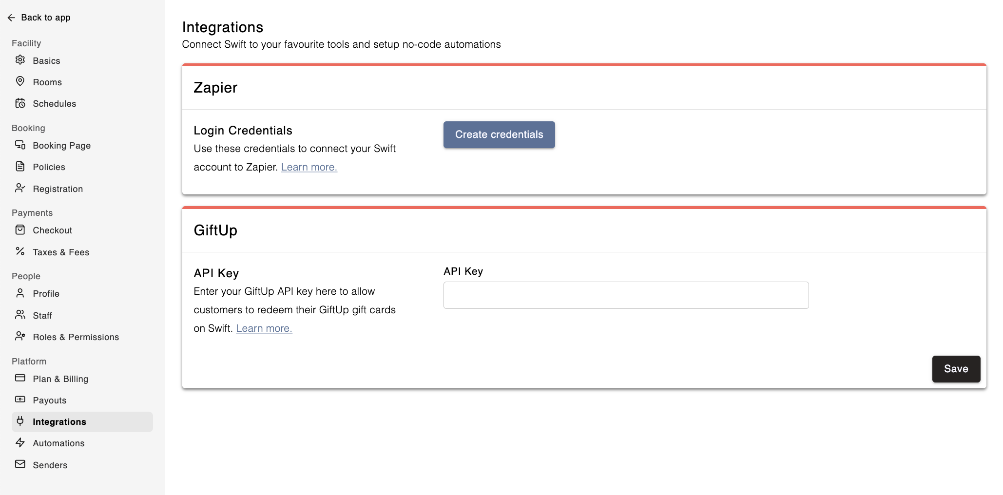 This is where you will enter your GiftUp API key after you have created your GiftUp account. You'll need to be the Owner of the account, or have the appropriate permissions to view this page.