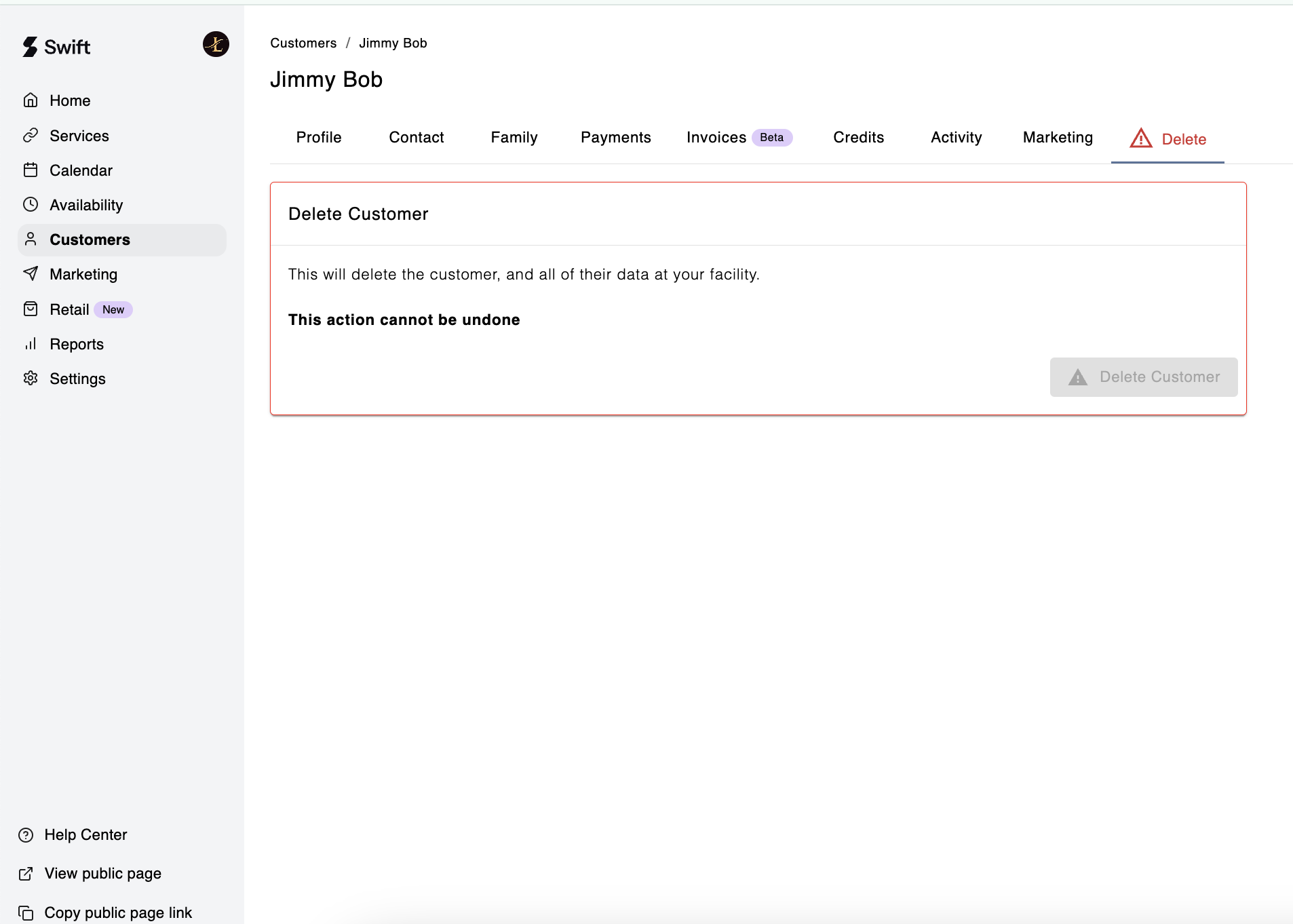 If you run into any issues deleting a customer account, please email Swift at support@runswiftapp.com and include the customer’s name and email address.