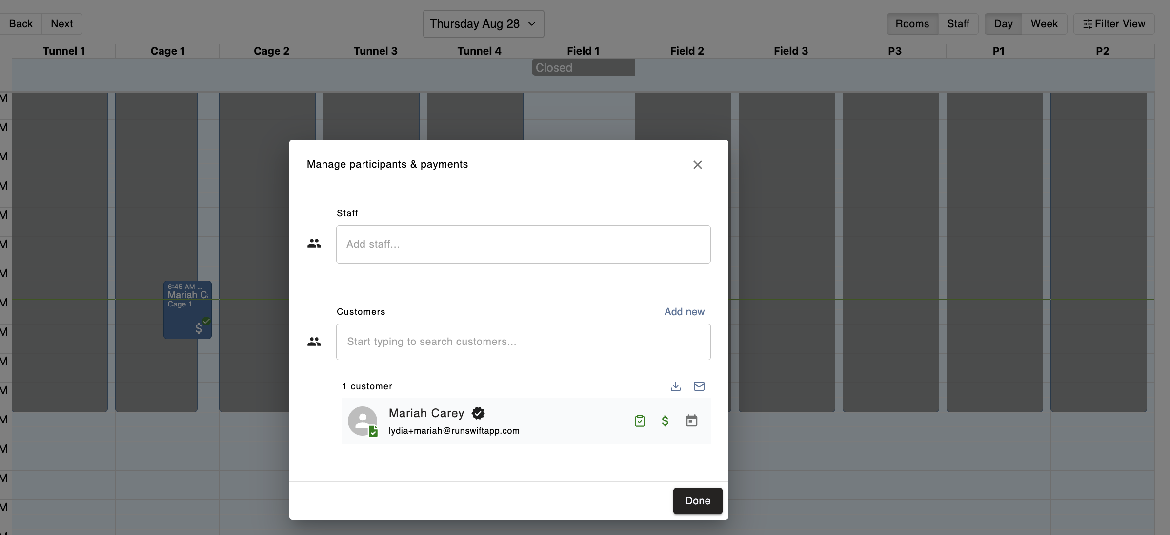 Click on a booking tile and select Manage Participants and Payments to see attendance details for each participant.